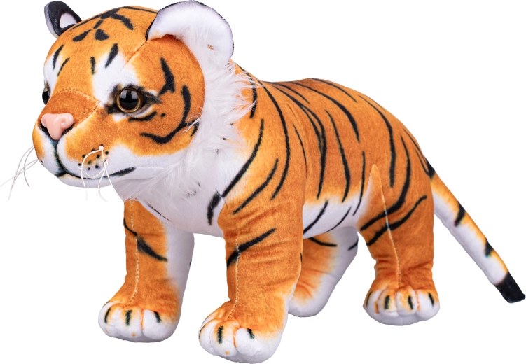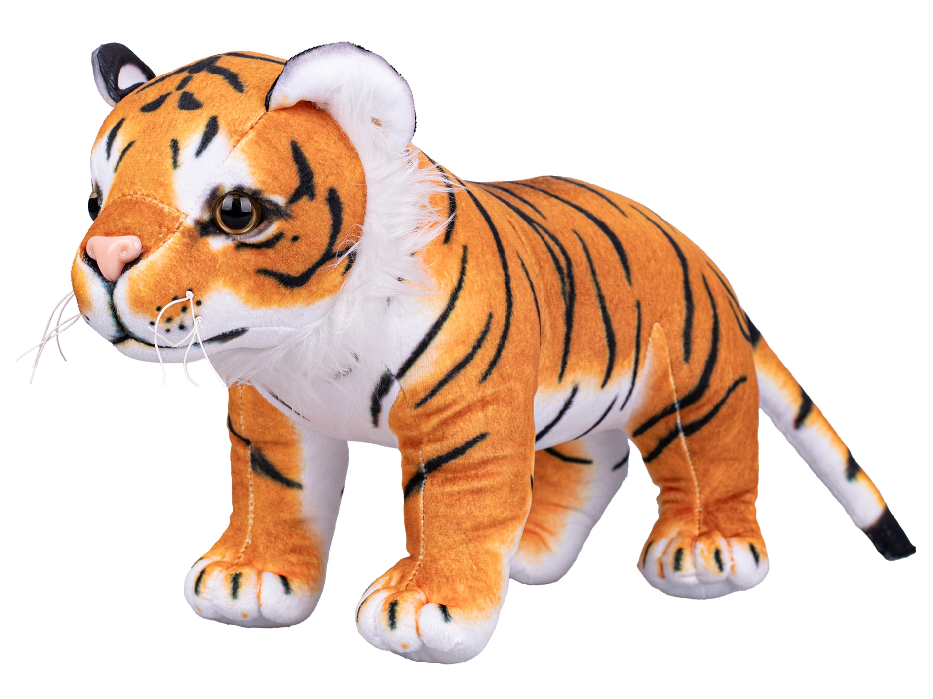Schattige pluchen Bengaalse tijger van 35 cm is een knuffelzachte metgezel voor de allerkleinsten vanaf de geboorte. Biedt een realistische uitvoering, zacht materiaal voor een aaibare touch en een staande houding, waardoor hij ideaal is om mee te knuffelen en als decoratie voor de kinderkamer. De veilige afwerking ondersteunt de zintuiglijke ontwikkeling en de kinderfantasie.