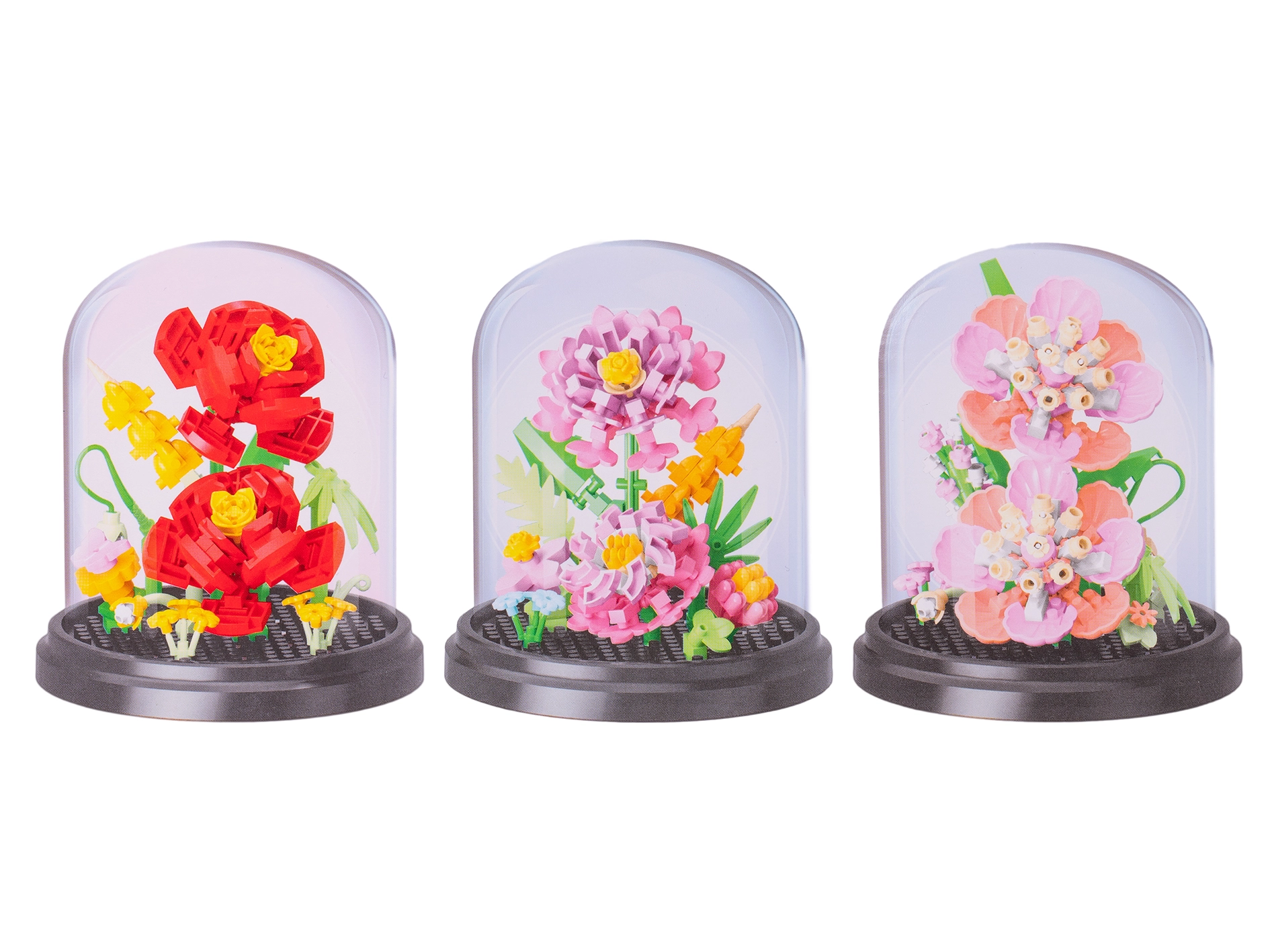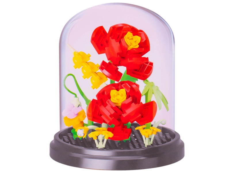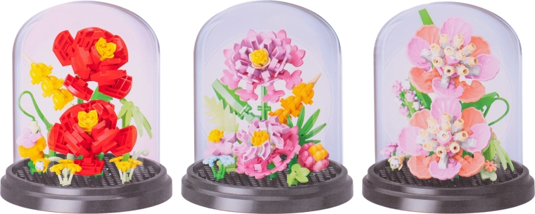 Deze bloemenbouwset bezorgt zowel kinderen als volwassenen plezier bij het bouwen en een prachtig resultaat dat mooi staat op een plank of bureau. Van 224–229 plastic stukjes maak je een realistisch model van een van vier populaire bloemen. De gebouwde bloem zet je eenvoudig neer dankzij de transparante stofkap, die haar beschermt tegen vuil.