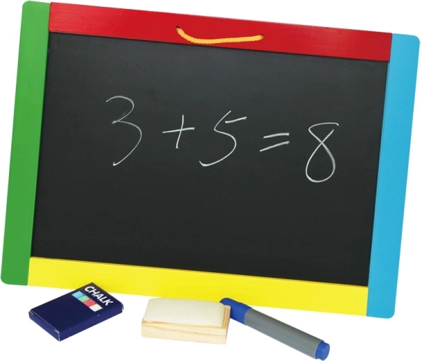 In de verpakking vind je alles wat je nodig hebt: het bord met ophangkoord, een set krijt en stiften en een uitwis-sponsje. De duurzame houten constructie zorgt voor stabiliteit en veilig gebruik.