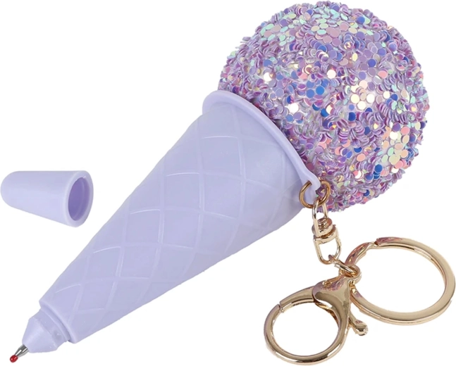 Stijlvolle Glamour sleutelhanger in de vorm van een ijsje combineert een praktische pen met een speels design. Gemaakt van duurzaam plastic, ongeveer 14 cm lang en door het glinsterende paarse oppervlak direct een blikvanger. Makkelijk te bevestigen aan sleutels, rugzak of handtas en een geweldig klein cadeautje voor kinderen vanaf 3 jaar en speelse volwassenen.
