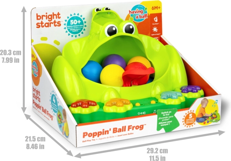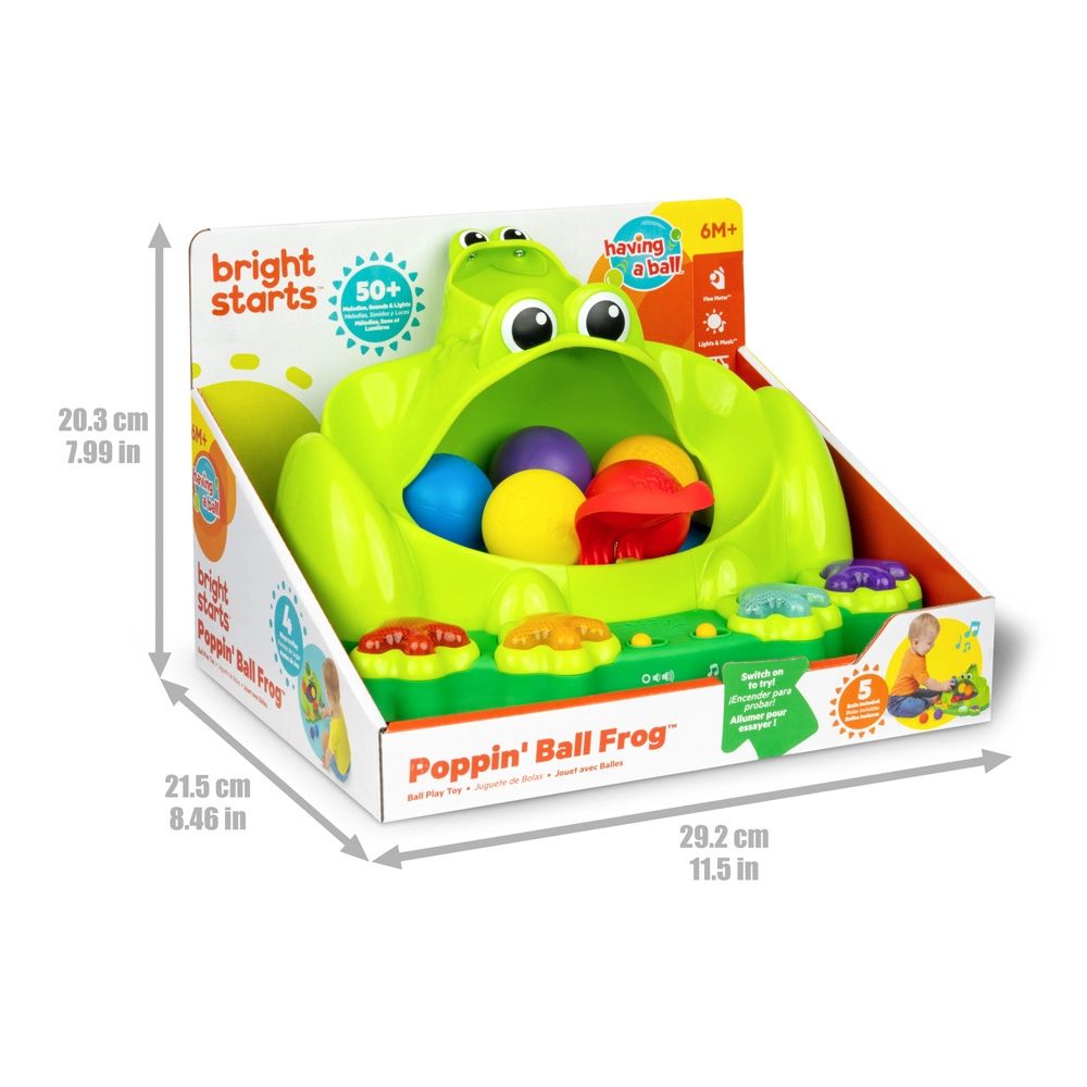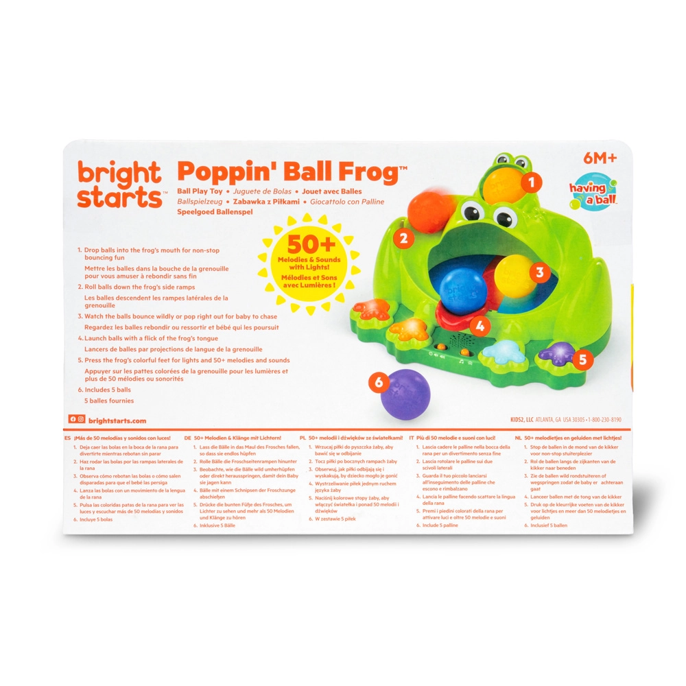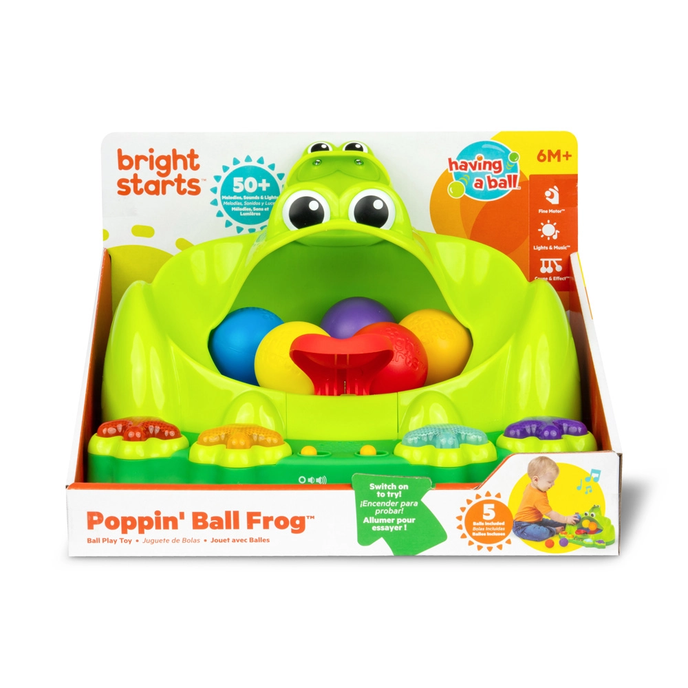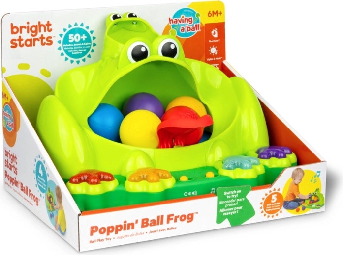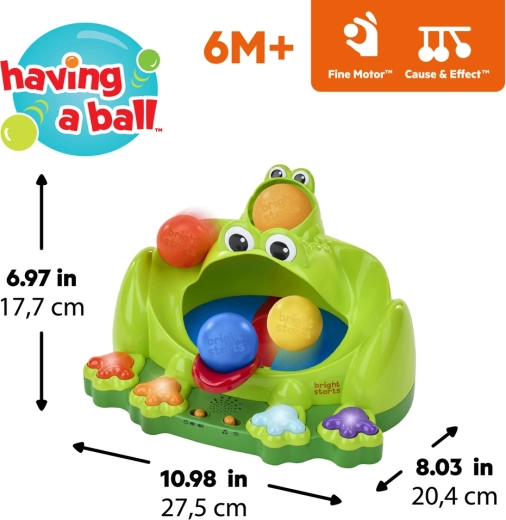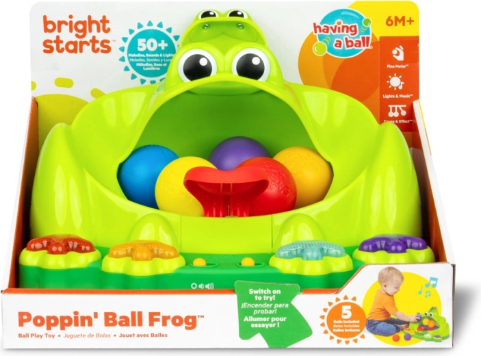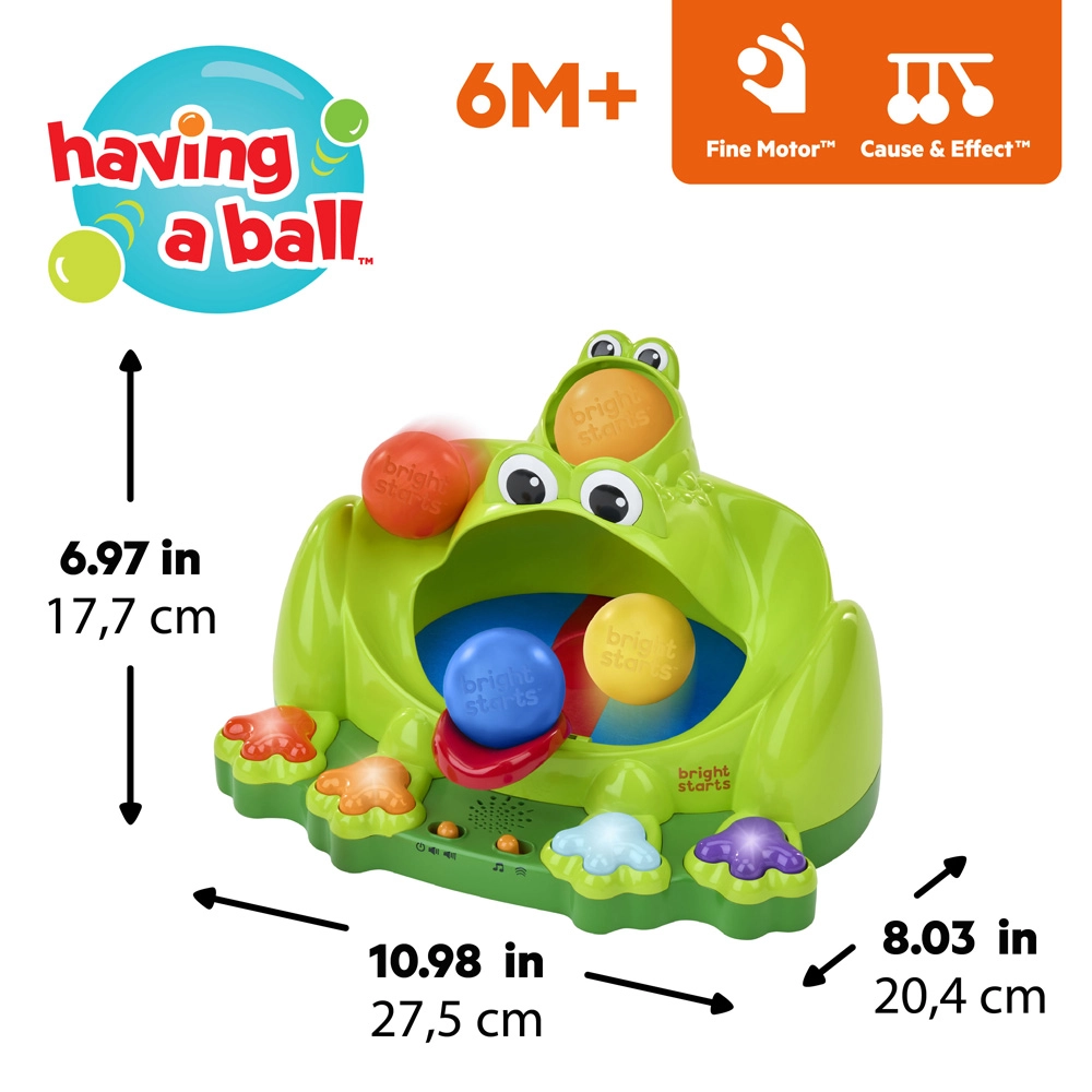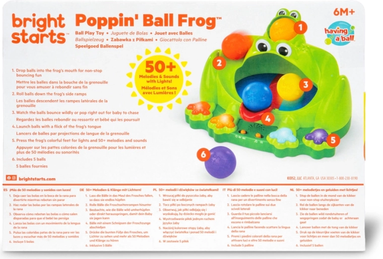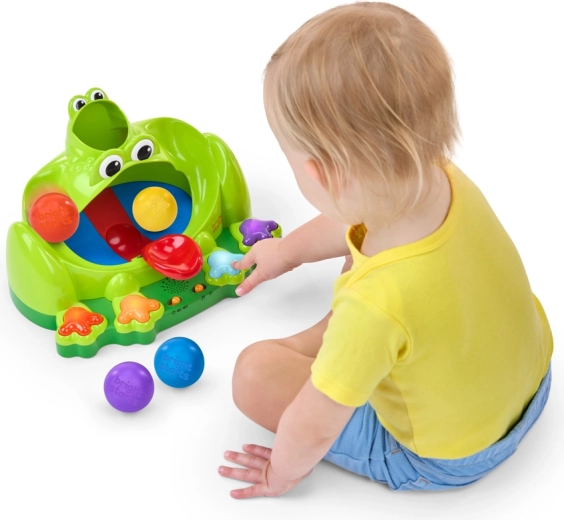 Laat je baby de wereld van spel met balletjes ontdekken – de interactieve kikker BRIGHT STARTS Poppin' Ball Frog brengt opspringende balletjes, lichten en meer dan 50 melodieën en geluiden. Kinderen zullen de 4 speelwijzen (gooien, wegschieten, rollen en drukken) geweldig vinden; ze ontwikkelen oorzaak en gevolg, fijne motoriek en oog-handcoördinatie en stimuleren kruipen en bewegen.
