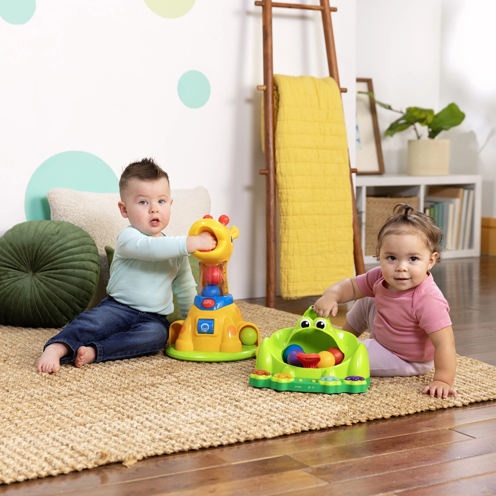 Deze schattige kikkervriend wordt het middelpunt van het speelplezier thuis. Gooi een van de 5 kleurrijke balletjes in de brede kikkermond en kijk hoe de ingebouwde “trampoline” ze weer terug laat stuiteren. Kinderen kunnen op de kleurrijke “pootjes” drukken die lichteffecten en rijke geluidsfeedback activeren, en de balletjes langs de zijkanten over de hellingen laten rollen om steeds opnieuw de magie van oorzaak en gevolg te ontdekken.
