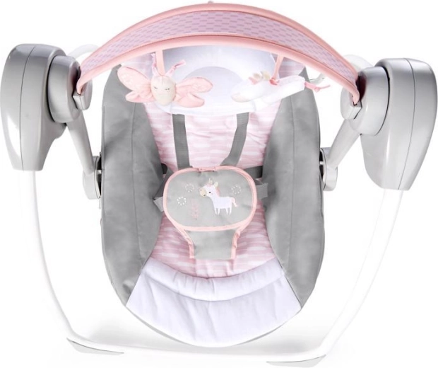 Stel je baby op elk moment en overal gerust en vermaak hem of haar met de compacte babyschommel Ingenuity Flora the Unicorn. Biedt 2 zitposities, 12 melodieën met volumeregeling, stille WhisperQuiet-werking en een timer van 30/45/60 min. Een afneembare speelboog met 2 pluchen speeltjes, zachte wasbare hoezen en 5-puntsgordels zorgen voor comfort en veiligheid vanaf de geboorte tot 9 kg.