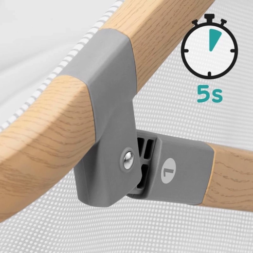 De constructie van licht aluminium met houtdecor biedt stabiliteit en een laag gewicht, perfect voor op reis. Het systeem voor snel in- en uitklappen zonder gereedschap bespaart tijd – ingeklapt in 5 seconden. Inclusief een kwalitatieve schuimmatras met verhoogde veerkracht en duurzaamheid en een praktische transporttas. Sofi werd bekroond op de beurs Kid’s Time 2019.