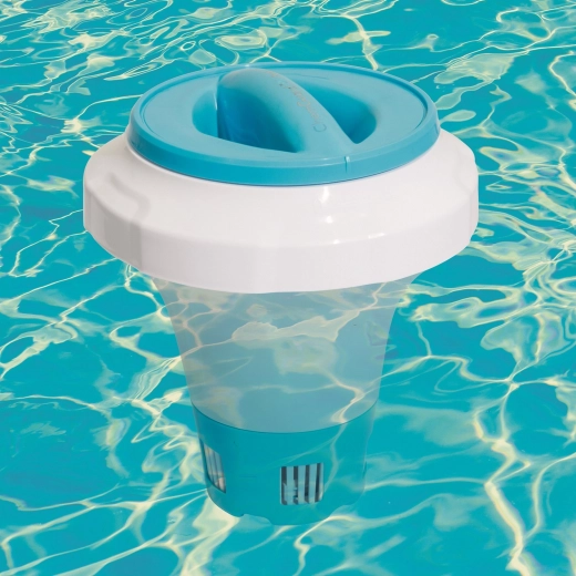De praktische drijvende chemiedispenser van BESTWAY zorgt voor een veilige en gelijkmatige desinfectie van het water in uw zwembad. Dankzij de regelbare ring stelt u eenvoudig de doseerintensiteit in, de rubberen handgreep beschermt uw handen bij het hanteren en het slijtvaste polypropyleen garandeert een lange levensduur. Geschikt voor chloor- of broomtabletten tot een diameter van 7,6 cm.
