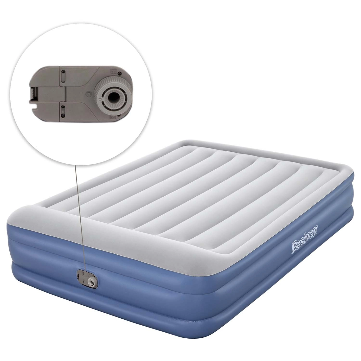 Tweedelige opblaasbare BESTWAY-luchtmatras met afmetingen 203 × 152 × 46 cm biedt comfortabele slaap voor 2 personen, snel opblazen met de ingebouwde elektrische pomp in ca. 4 minuten en een stabiele I‑beam-constructie van duurzaam Tritech-materiaal. Voorzien van een suède-achtig (flock) oppervlak voor extra comfort, een geïntegreerde kussenrand en in de verpakking ontbreken draagtas en reparatiepatch niet.