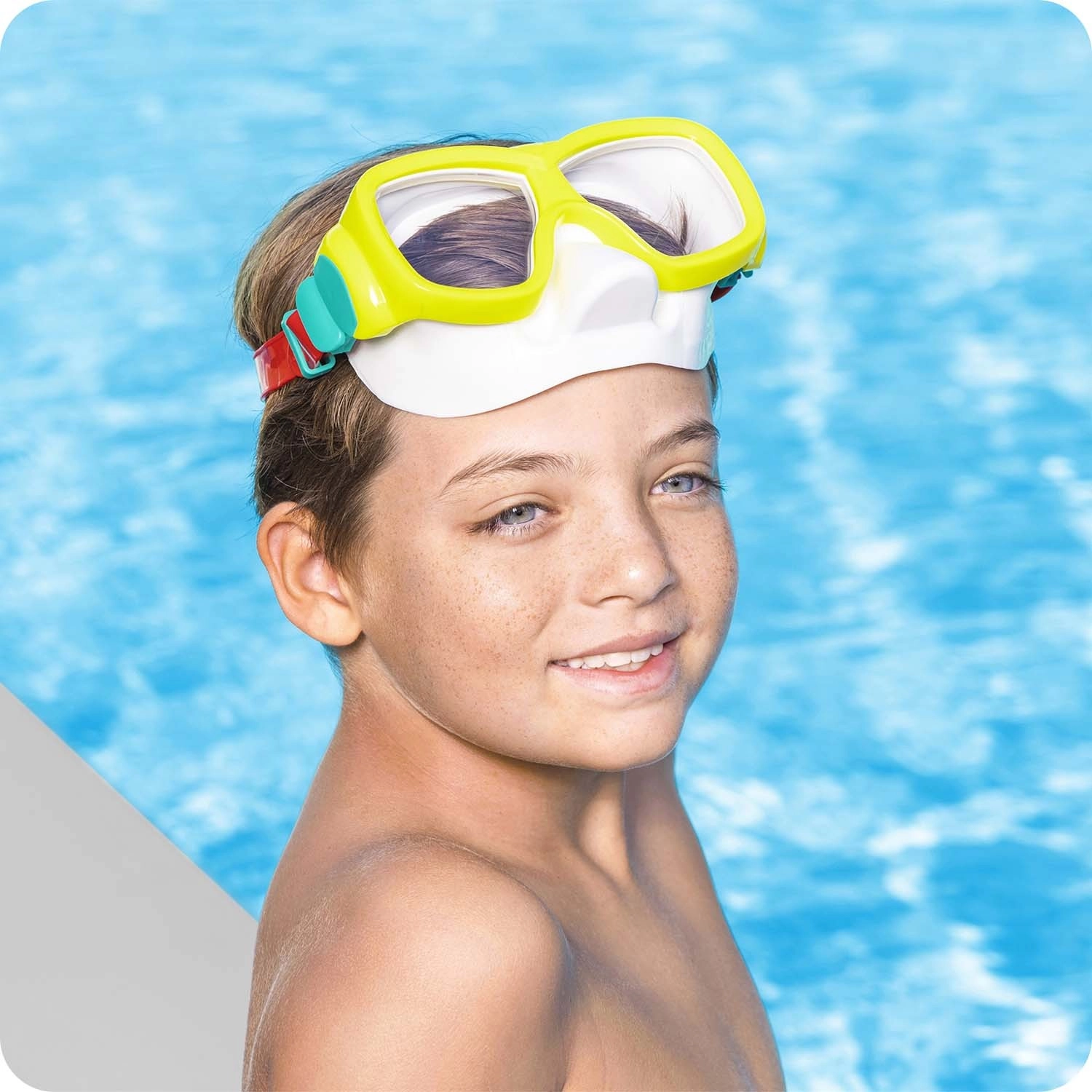 Ontdek het plezier van zwemmen en snorkelen met deze kinderduikbril van Bestway, die een breed gezichtsveld, een comfortabele pasvorm op het gezicht en een verstelbare band voor een veilige houvast biedt. Polycarbonaat lenzen met UV-bescherming beschermen de ogen en zorgen voor helder zicht onder water. Vrij van latex en in universele maat voor kinderen vanaf 7 jaar.