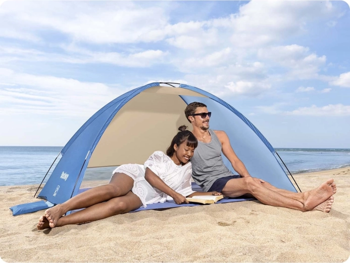 Geniet van comfort en veiligheid op het strand met de Bestway Beach Ground 2 strandtent. De duurzame 190T polyester met PA-coating 300 mm en de hoge UV-bescherming UPF 80+ beschermen tegen de zon en lichte regen, terwijl de open voorzijde zorgt voor luchtcirculatie. Dankzij de glasvezel stokken is de constructie flexibel, stabiel en snel klaar voor gebruik.