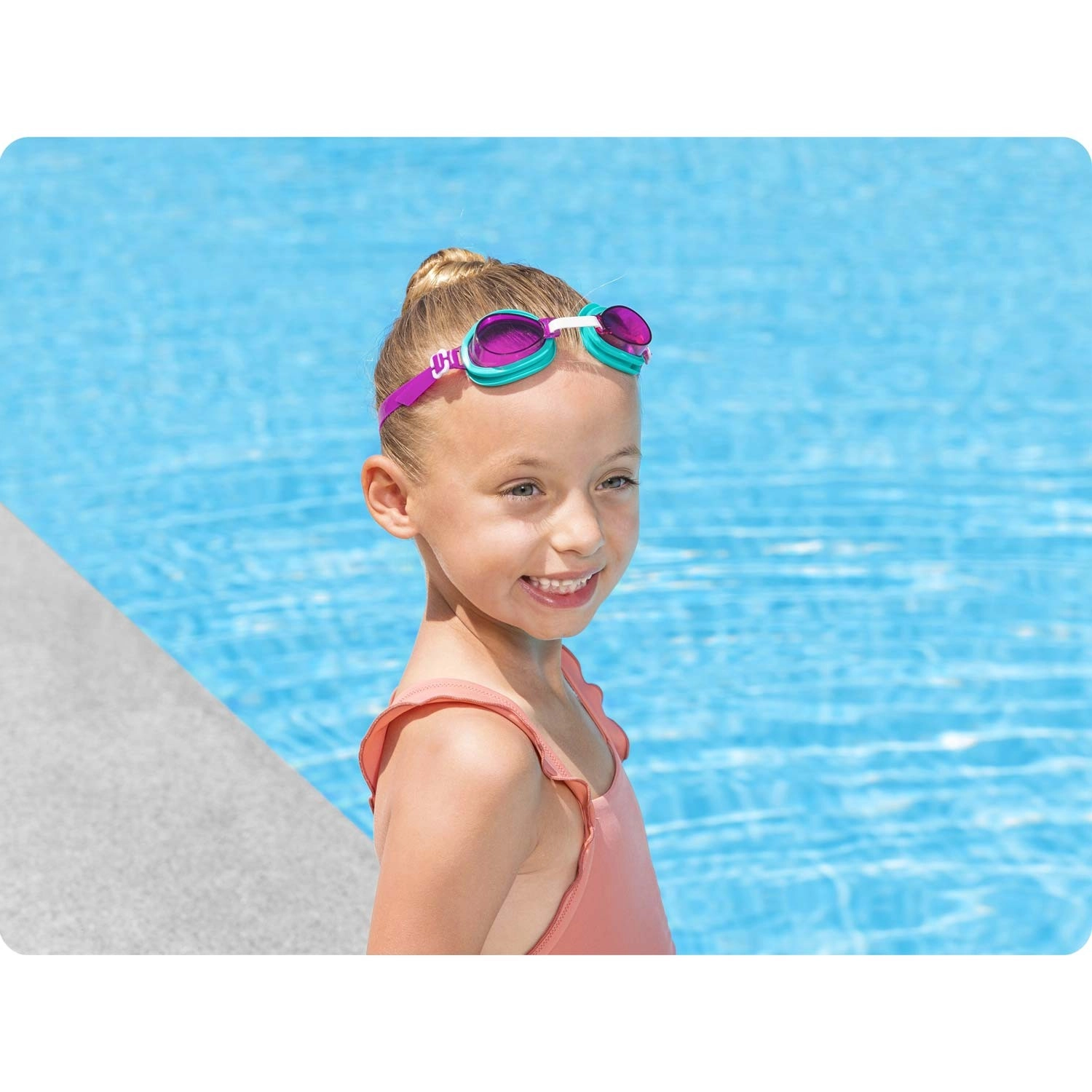 Deze BESTWAY kinderzwembril combineert comfort, veiligheid en stijl. Zachte, hypoallergene lenzen en siliconen afdichtingen passen zich zacht aan het gezicht aan, beperken waterinloop en verhogen het comfort bij zwemmen en duiken. De paars-turquoise kleurcombinatie is aantrekkelijk en goed zichtbaar bij het zwembad.
