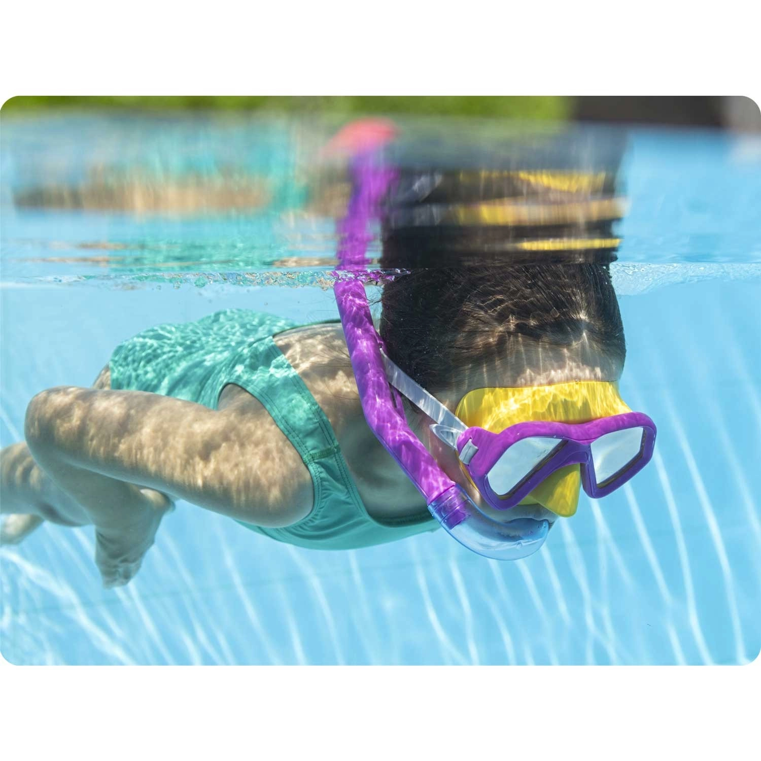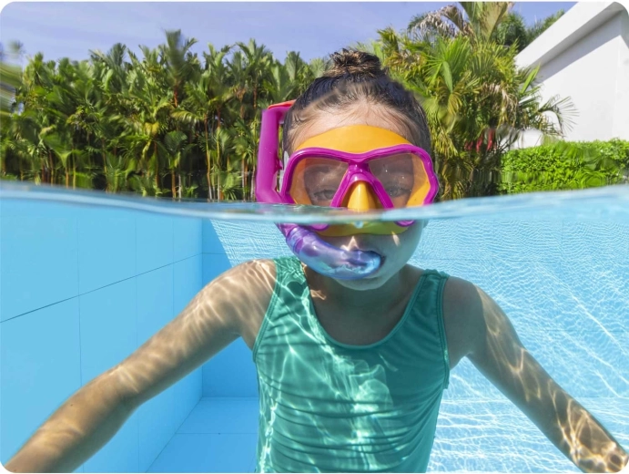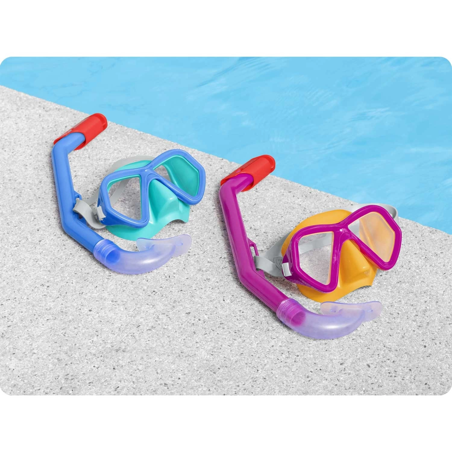De set bevat ook een snorkel met een comfortabel siliconen mondstuk dat zich natuurlijk aan de mond aanpast, en een bovenkap die voorkomt dat opspattend water van het oppervlak naar binnen komt. De set is latexvrij, huidvriendelijk en geschikt voor regelmatig waterplezier in het zwembad en aan zee.