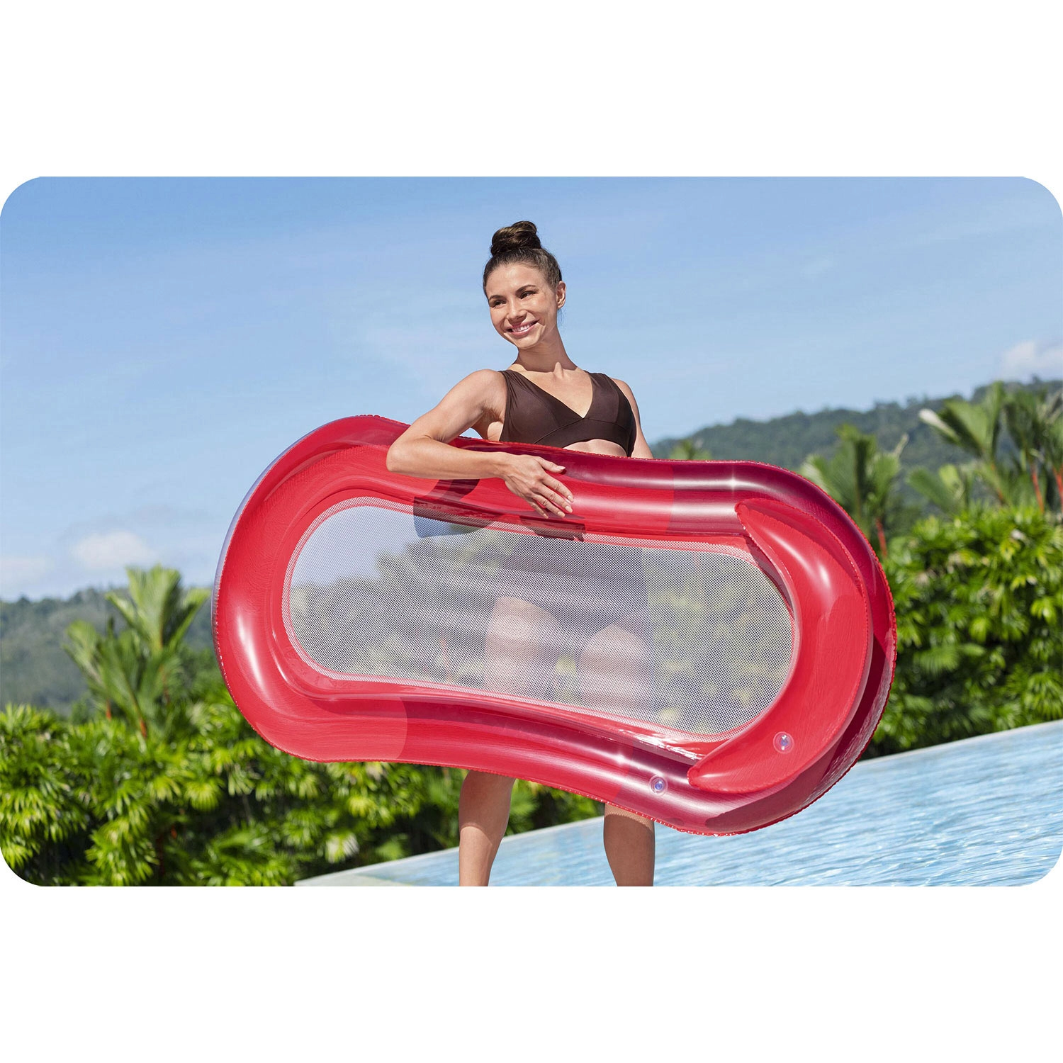 Het centrale ademende gaas laat water door, koelt aangenaam en verhoogt tegelijk het ligcomfort. Dankzij het duurzame PVC is de lounge licht, gemakkelijk mee te nemen en klaar voor vele seizoenen bij het zwembad, meer of aan zee.