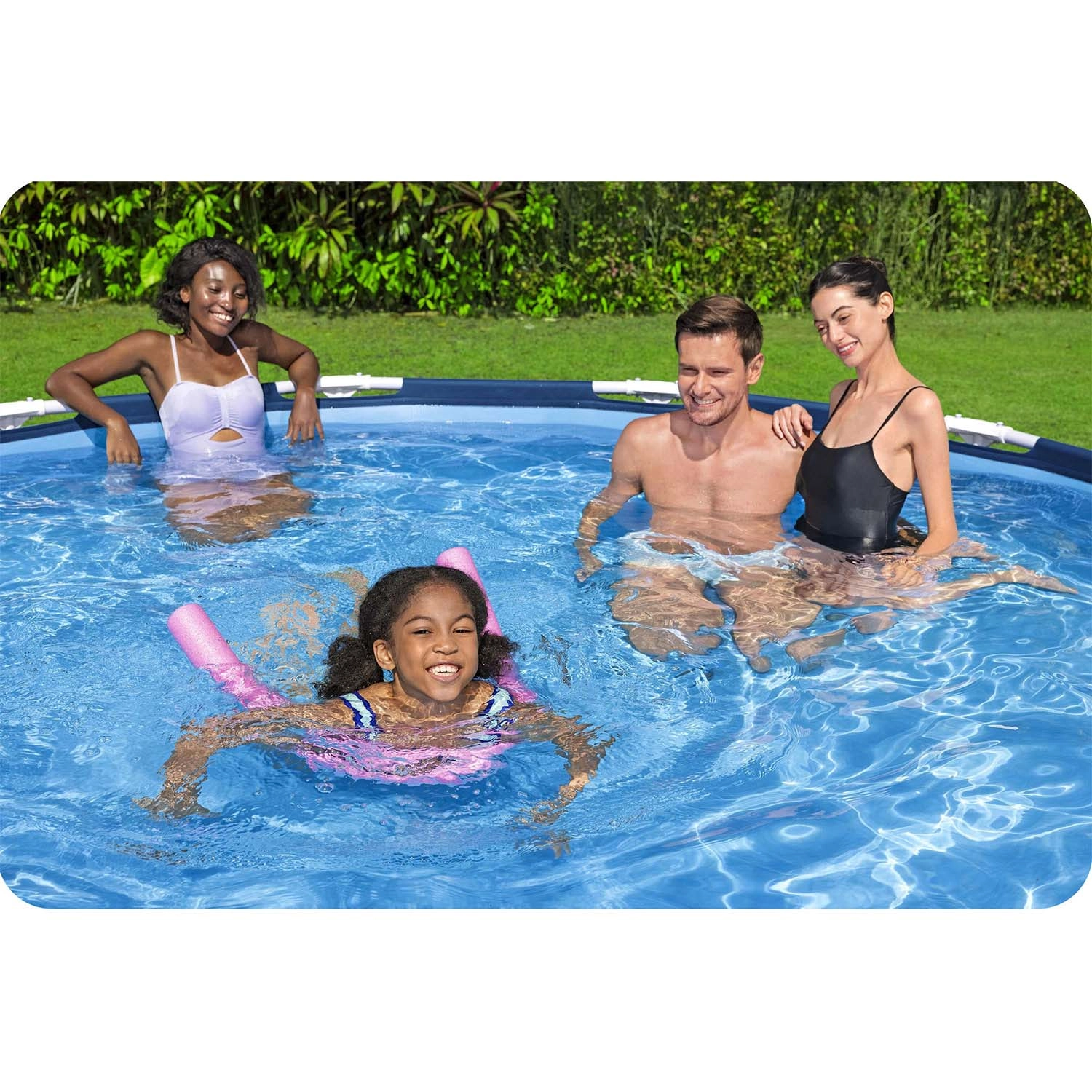 De montage rond je af in drie eenvoudige stappen – de folie uitrollen, het frame zonder gereedschap monteren en met water vullen. Er is ook een opblaasbal bijgevoegd voor nog meer waterpret.