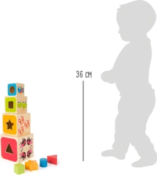 Elk blok is versierd met vrolijke dierenmotieven en opvallende kleuren die uitnodigen tot ontdekken. Precieze openingen stimuleren geduld en concentratie, en het bouwen van een toren ondersteunt de stabiliteit van de hand en ruimtelijke verbeelding. Het hoogwaardige houten materiaal voelt prettig aan en is bestand tegen dagelijks spelen.