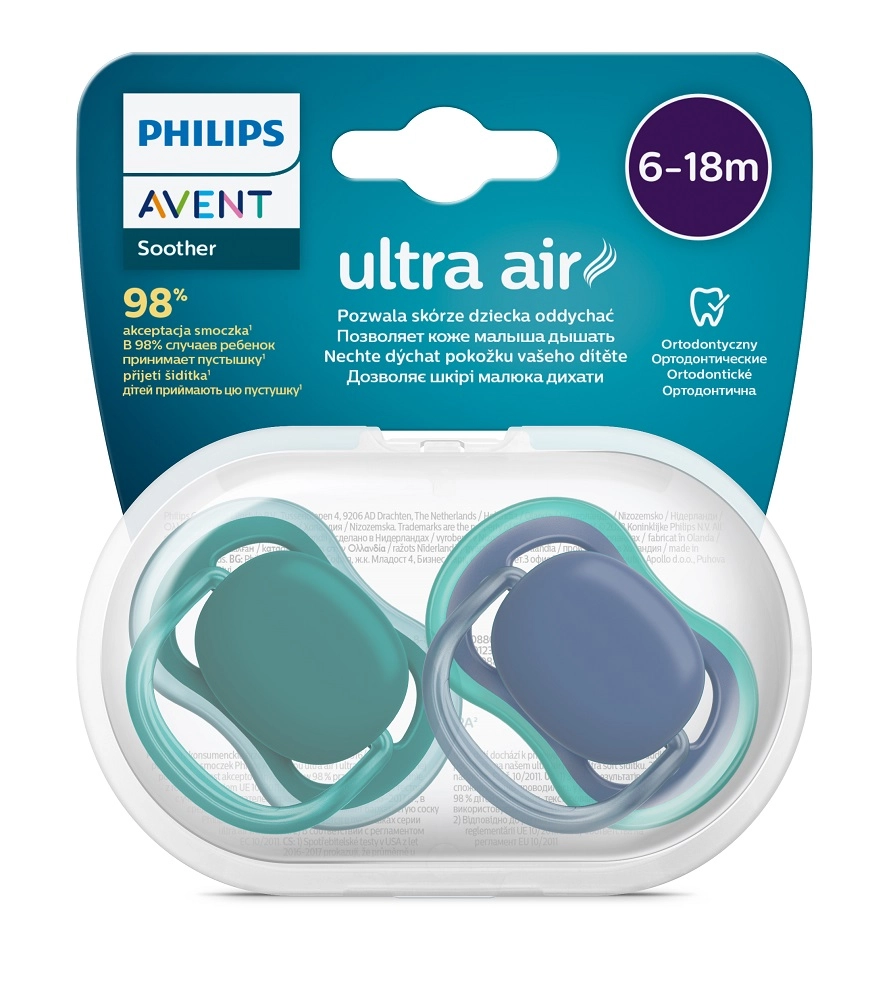 Philips Avent Ultra Air is een lichte, comfortabele en ademende fopspeen die is ontworpen om huidirritatie rond de mond te minimaliseren. Dankzij de grote luchtopeningen blijft de babyhuid droger, ook bij langer gebruik. De siliconen speen met textuur voelt natuurlijk aan en is prettig om aan te raken.
