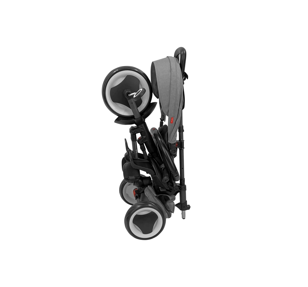 De veiligheid wordt gewaarborgd door 5‑puntsgordels, een afneembare veiligheidsbeugel en remmen op de achterwielen. Antivibratie EVA‑wielen dempen oneffenheden en zijn onderhoudsvrij. Compactheid en snelle handling zijn vanzelfsprekend: je vouwt de driewieler zonder gereedschap in 3 kliks en dankzij het slimme design verplaats je hem na het opvouwen als een reistas.