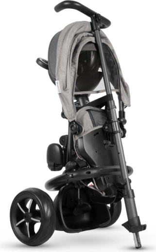 - Inklapsysteem met 3 klikken zonder gereedschap – snel op te bergen en te vervoeren; na het inklappen kun je de driewieler trekken als een reistas.
