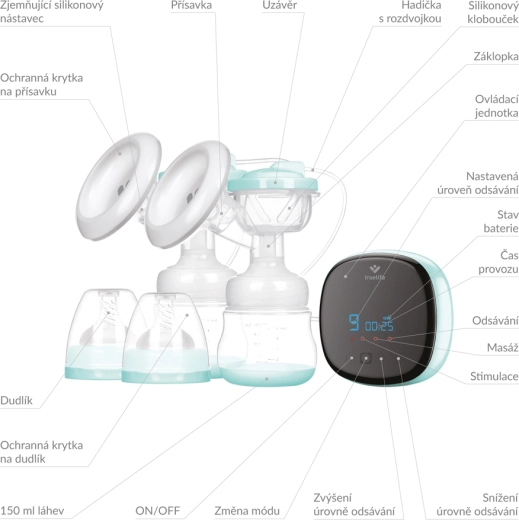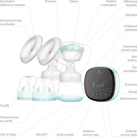 De bediening is eenvoudig dankzij het LED-display met touchknoppen en een praktische timer. Kies uit 3 modi – stimulatie, massage en kolven – en uit 9 intensiteitsniveaus voor maximaal comfort. Het lichte ontwerp, de compacte afmetingen en de batterij met een werktijd tot 150 minuten maken deze kolf ideaal voor thuis en onderweg. Zachte siliconen schildjes met een flexibele rand en BPA-vrije materialen zorgen voor veiligheid voor u en uw baby.