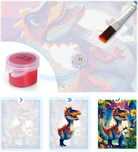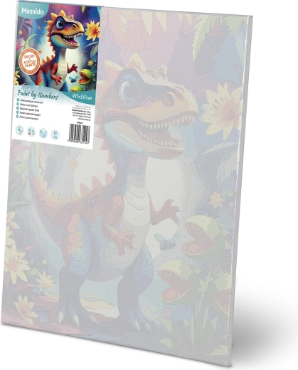 Ontdek het plezier van creëren met schilderen op nummer 40 × 50 cm met een dinosaurusmotief. De set bevat alles wat je nodig hebt: voorgeprepareerd canvas op spieraam, tot 30 dekkende acrylverven, 3 penselen in verschillende maten en haakjes om op te hangen. Dankzij de gekleurde ondergrond met fijne lijnen slagen ook beginners moeiteloos en wordt het resultaat intens van kleur en volledig dekkend zonder doorschijnende lijnen.