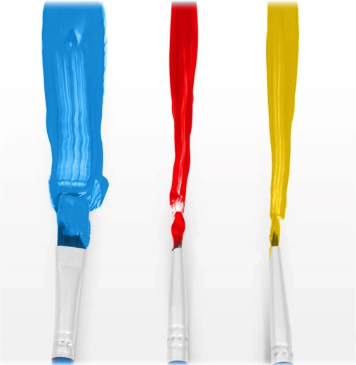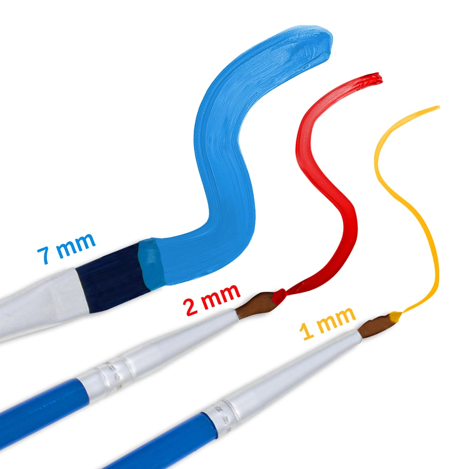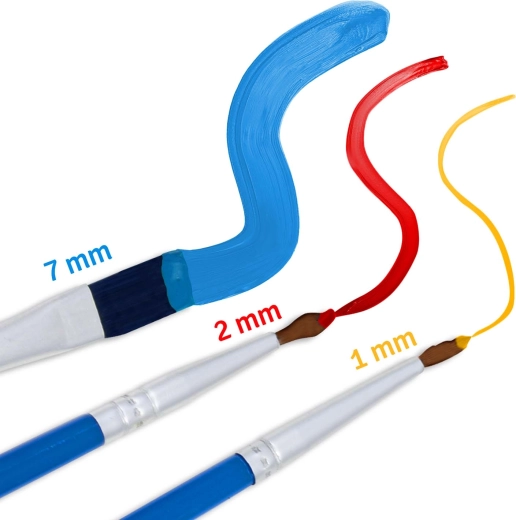 Drie penselen (1 mm, 2 mm en 7 mm) dekken grote vlakken en de kleinste details. Dikke, dekkende verven zorgen voor volledige bedekking zonder doorschijnende lijnen.