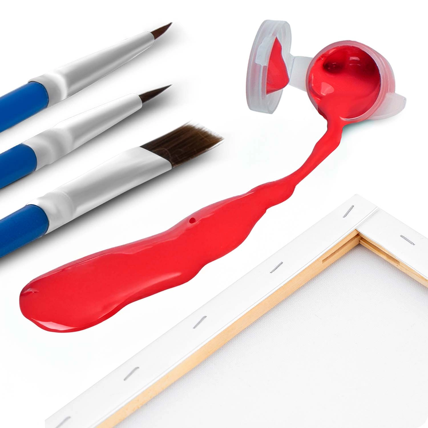 Complete set voor direct schilderplezier – voorgeprepareerd canvas op spieraam, tot 30 rijke acrylverven, 3 penselen in verschillende maten en ophanghardware.