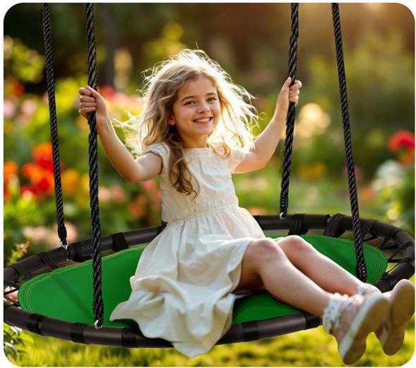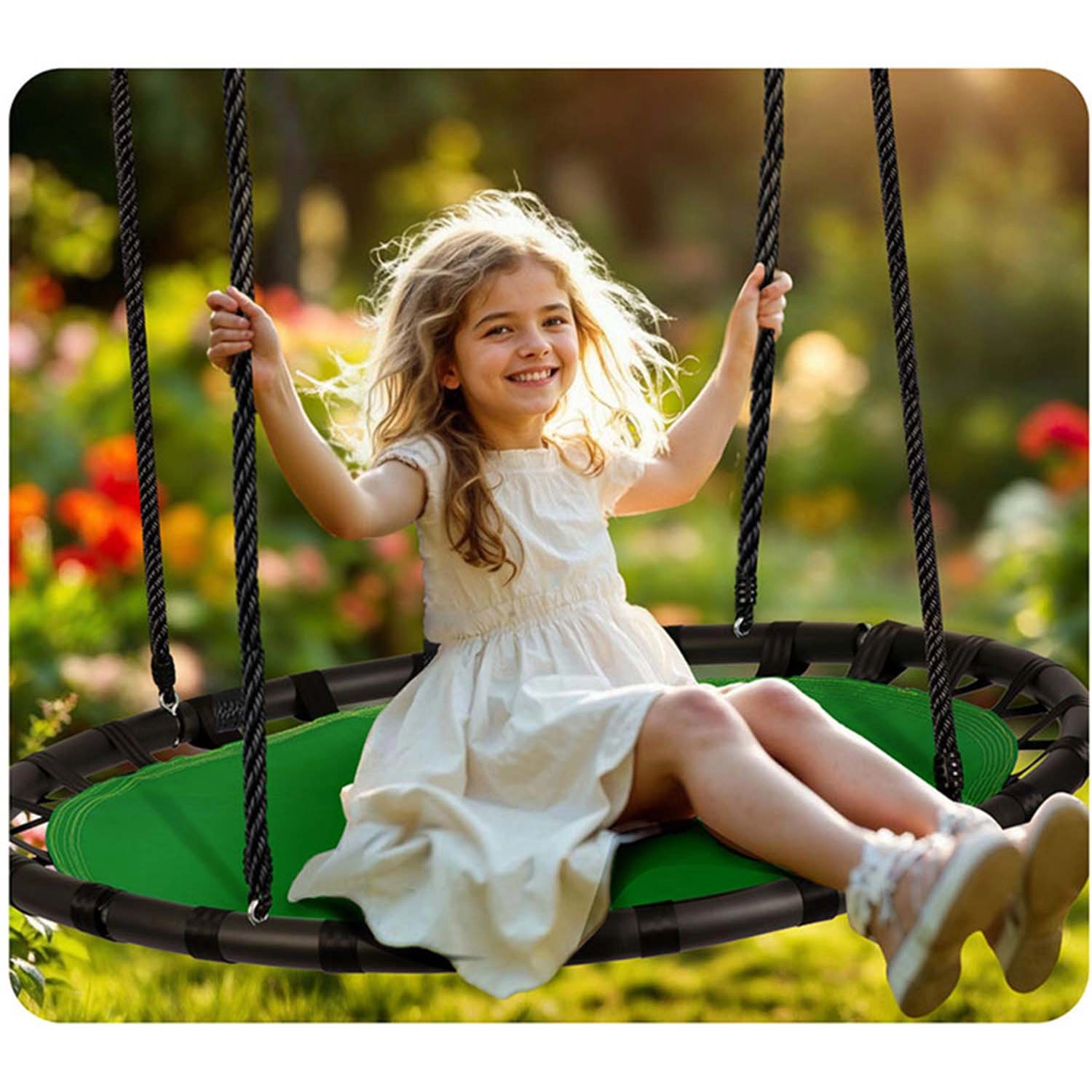 Geniet van buitenspeelplezier met de ruime vogelnestschommel met een diameter van 120 cm van NEO-SPORT. Biedt comfortabele zit, waterbestendig Oxford 600D-materiaal, een sterk stalen frame met schuimrubberen bekleding en stevige, verstelbare touwen voor een veilige en stabiele rit tot 150 kg. Makkelijk schoon te maken en ideaal voor zowel kinderen als volwassenen.