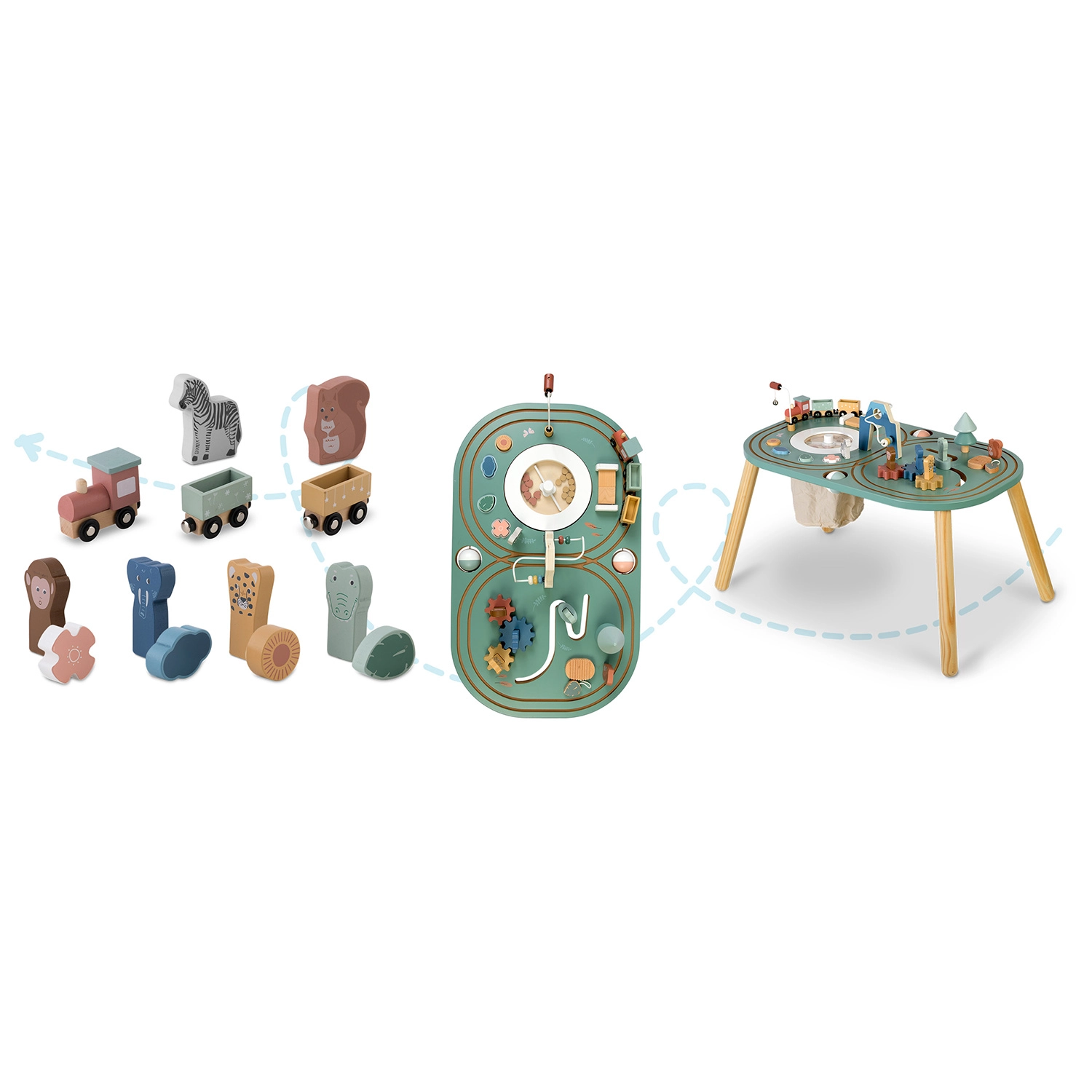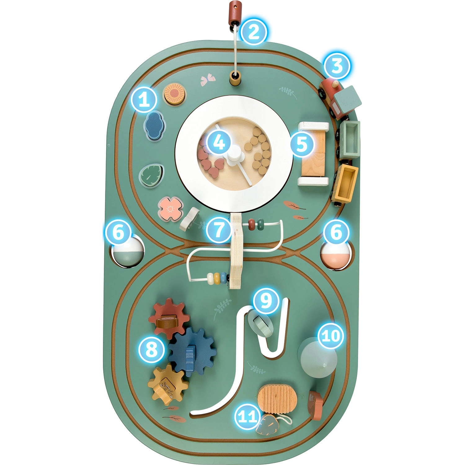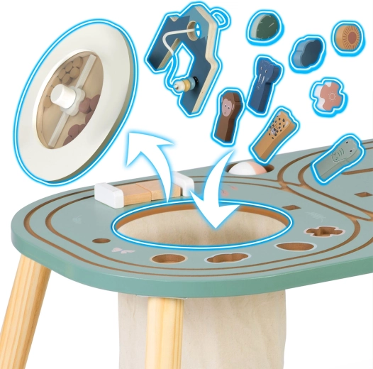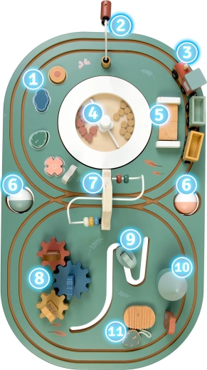- Multifunctioneel centrum: magnetisch treintje, knikkerbaan, tandwielen, doolhoven, belletje en sorteerkubussen.
