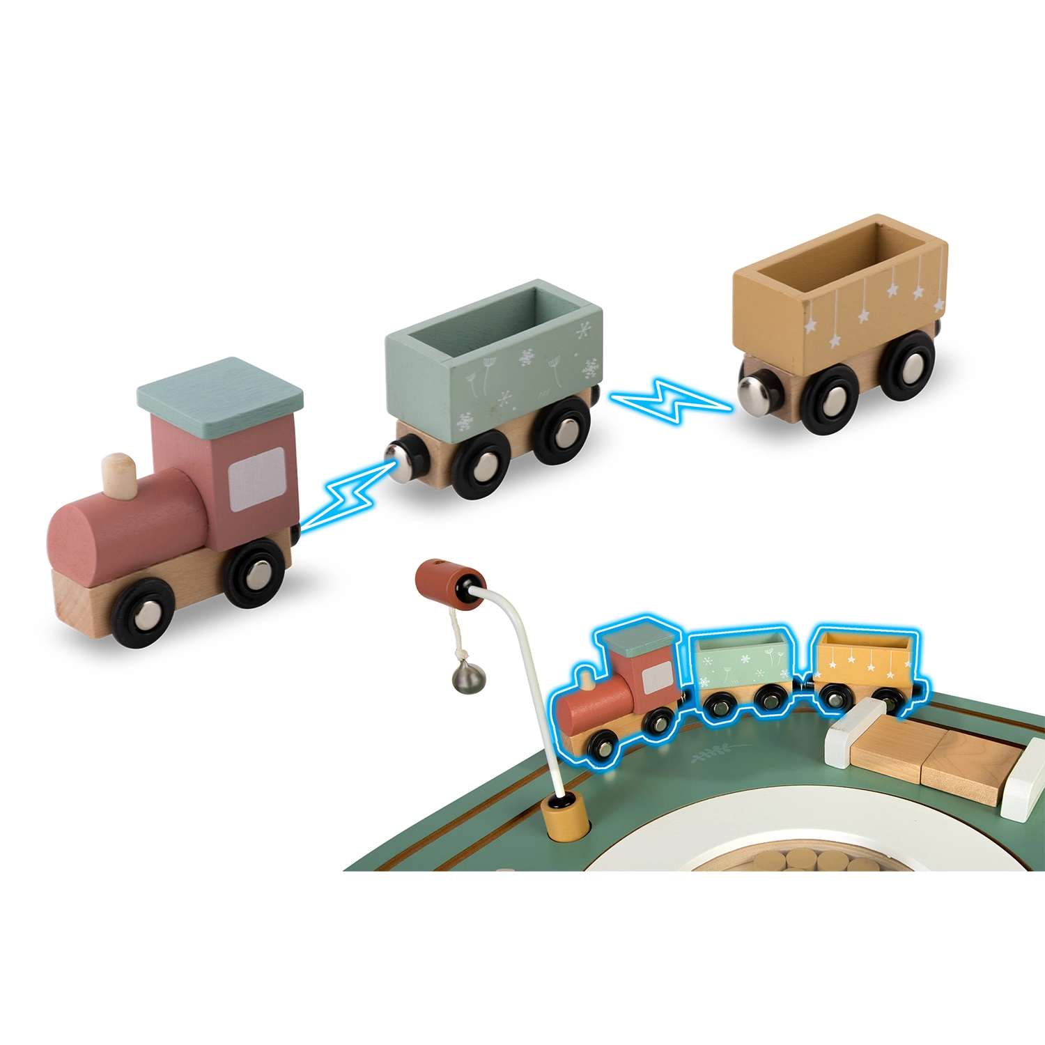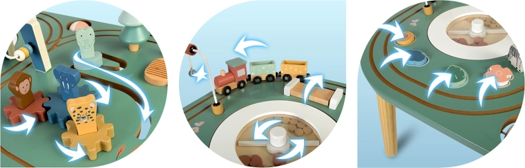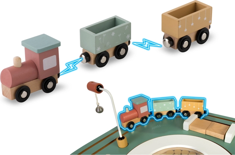 Het locomotiefje met magnetische wagonnetjes kan over het hele tafelblad rijden. Kinderen plannen de route, vervoeren diertjes en ontwikkelen zo hun verbeelding en fijne motoriek.