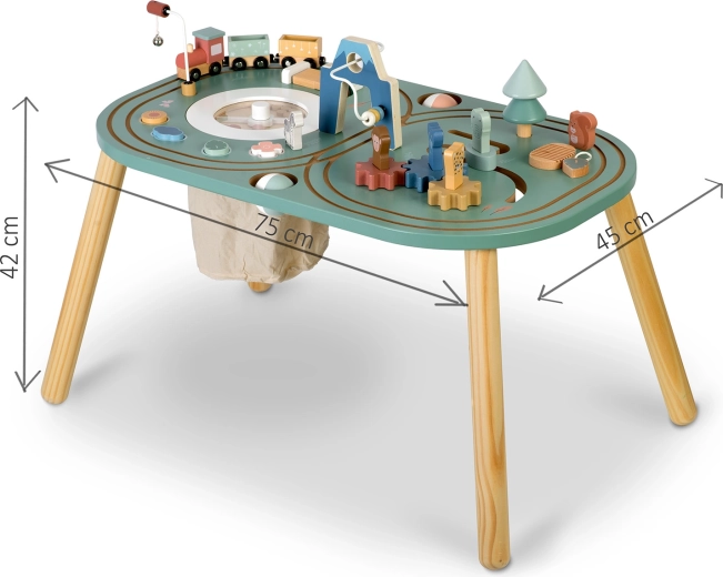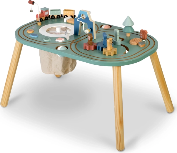 Ontdek de veelzijdige houten NUKIDO activiteitentafel met een treintje, knikkerbaan, doolhoven en tandwielen, die fijne motoriek, zintuiglijke waarneming en leren door spel volgens de principes van Montessori stimuleert. Gemaakt van hoogwaardig hout en geverfd met veilige verven, biedt hij een lange levensduur, een elegant design en een praktische textielen opbergzak voor onderdelen direct onder het tafelblad.