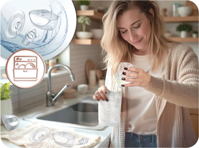 Dankzij de draadloze werking en opladen via USB‑C neem je de kolf gemakkelijk mee naar het werk, op reis of tijdens ontspanning. Siliconen massageranden in drie maten stimuleren zacht de melkstroom en zorgen voor aangename verlichting. Het flesje met een inhoud van 150 ml heeft een veiligheidsdop tegen morsen. Alle niet-gemotoriseerde onderdelen kunnen in de vaatwasser, wat tijd bespaart en hoge hygiëne waarborgt.