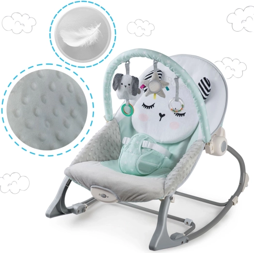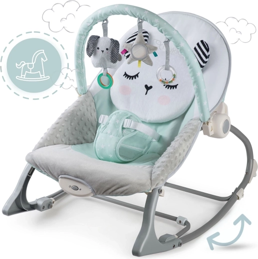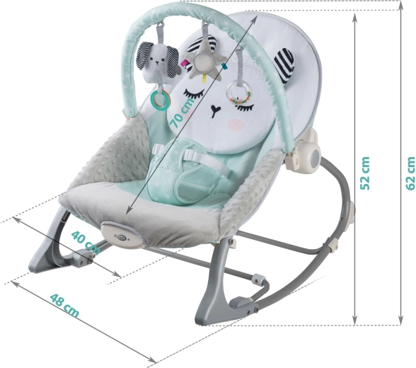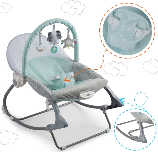 De afneembare speelboog met knisperende pluchen speeltjes ondersteunt de ontwikkeling van zicht en tast. Zachte, huidvriendelijke hoezen zorgen voor comfort en kunnen eenvoudig worden verwijderd en met de hand gewassen. De stabiele constructie met een metalen frame en de mogelijkheid om het schommelen te vergrendelen breidt het gebruik van het ligstoeltje uit volgens de actuele behoeften.