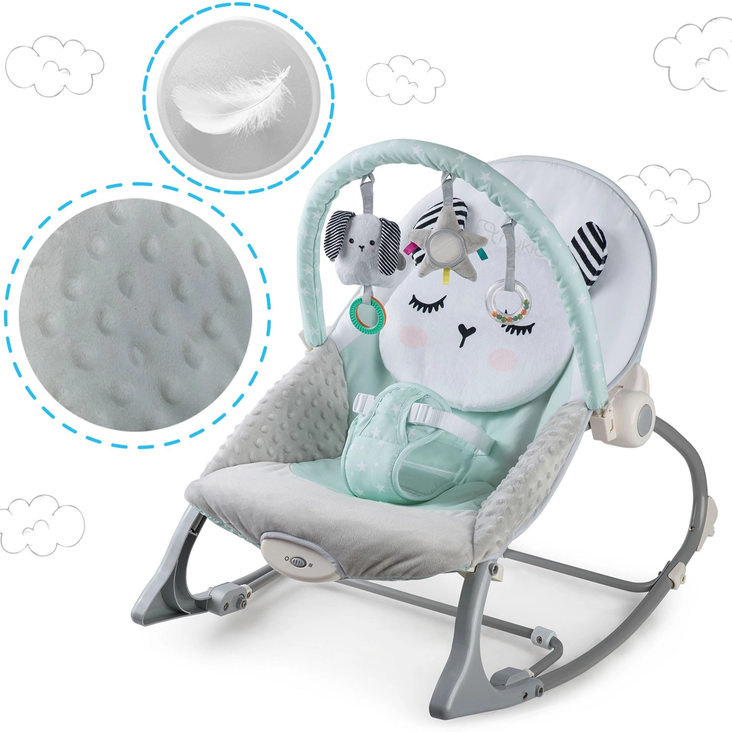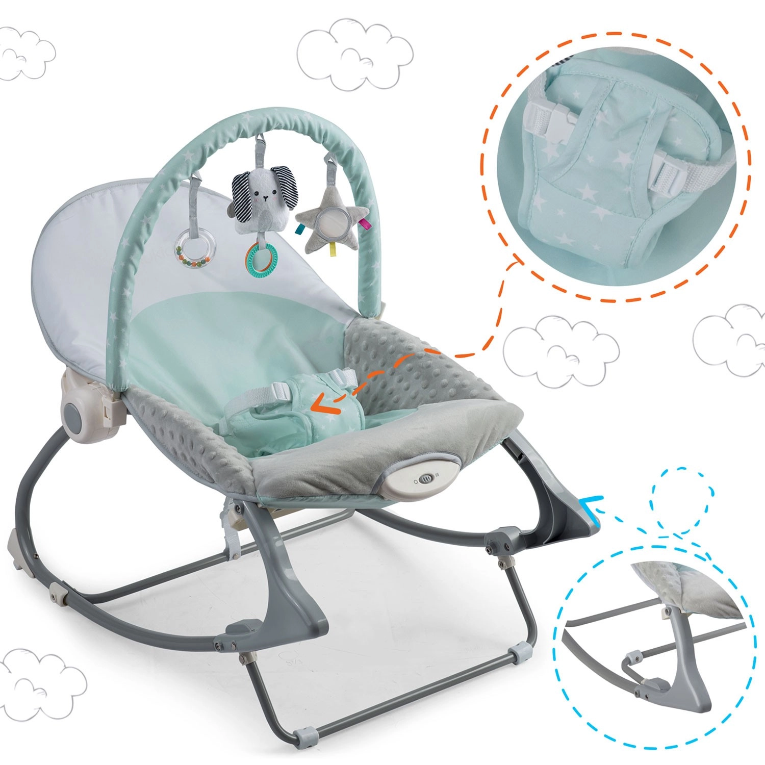 Het multifunctionele babyligstoeltje NUKIDO in mint brengt rust voor je kleintje en vrije handen voor ouders. Het biedt kalmerende vibraties, zacht schommelen met de mogelijkheid tot vergrendeling, een afneembare speelboog met speeltjes voor zintuiglijke stimulatie en zachte, comfortabele bekleding. Voor de veiligheid zorgen 3-puntsgordels en antislipvoetjes.