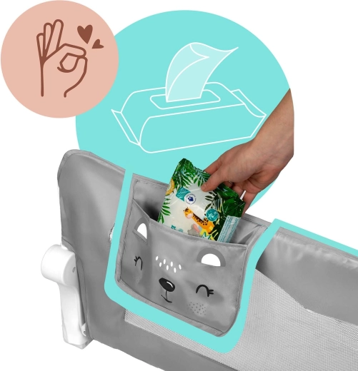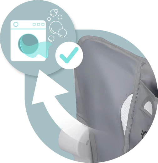 Meshpanelen zorgen voor luchtcirculatie en zicht op het kind. De hoes is eenvoudig afneembaar en wasbaar.