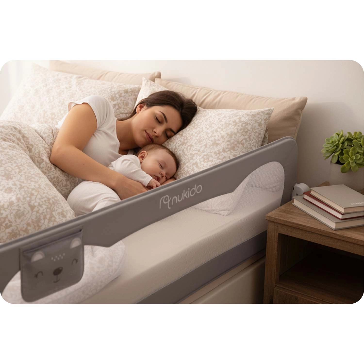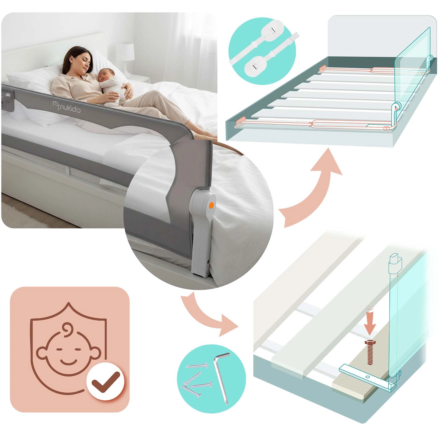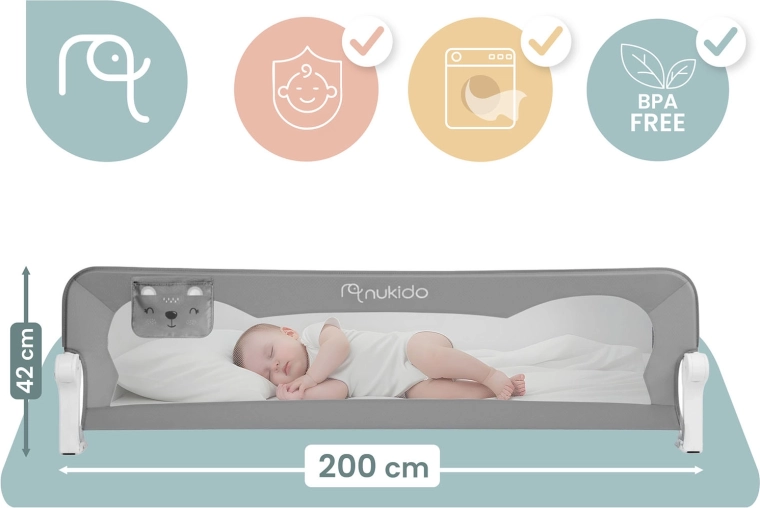Het Nukido bedhek van 200 cm is een praktische en stijlvolle oplossing voor grotere bedden en samen slapen. Het lichte maar sterke stalen frame in combinatie met het ademende mesh zorgt voor stabiliteit en tegelijk voor visueel contact met het kind. Het geïntegreerde SafetyLock-slot beschermt tegen onbedoeld neerklappen en dankzij het 180° draaimechanisme klap je het hek eenvoudig omlaag zonder demontage.