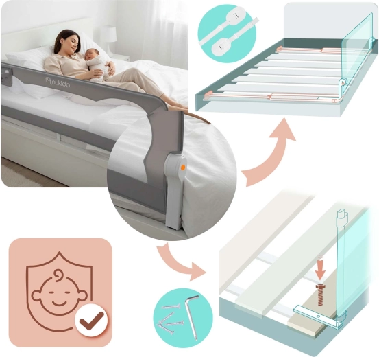 De installatie is snel en betrouwbaar: je schroeft het hek eenvoudig aan het bedframe en zet het vast met SafetyBelt-riemen met duurzame gespen voor langdurige, stevige fixatie. De hoes is afneembaar en wasbaar, waardoor het onderhoud eenvoudig en hygiënisch is. Het product voldoet aan de strenge Europese norm BS 7972:2001 + A1:2009 voor bedhekken.