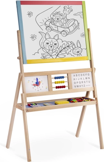 Ontdek het grote dubbelzijdige bord voor kinderen van Ricokids, dat een krijtbord- en magnetisch oppervlak in één combineert. Dankzij de stabiele constructie, draaibare plaat, lesklok, telraam en een uitgebreide set accessoires is het de ideale tool voor leren en creatieve pret.