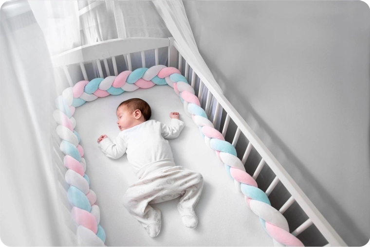 Het dicht gevlochten, zachte materiaal dempt stoten tegen de spijlen en creëert een rustige, beschutte plek om te slapen.