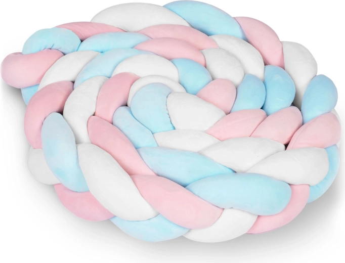 Zachte, gebreide bedbumper voor de babyledikant RICOKIDS met een lengte van 3 m in een modieuze blauw‑roze combinatie zorgt voor veiligheid vanaf de eerste dag, bescherming tegen stoten en een gezellige sfeer. Hij is anti‑allergeen, aangenaam aan de huid en eenvoudig te onderhouden door te wassen op 30 °C.