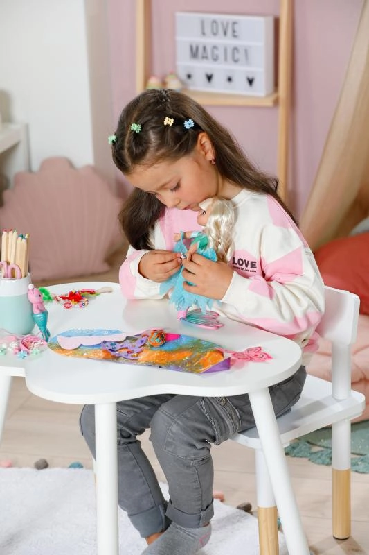 Opklikbare versieringen, textiele accessoires en decoraties laten kinderen eindeloze combinaties maken van kapsels en de look van de staartvin – iedere keer anders en origineel.