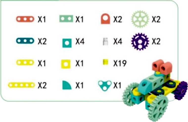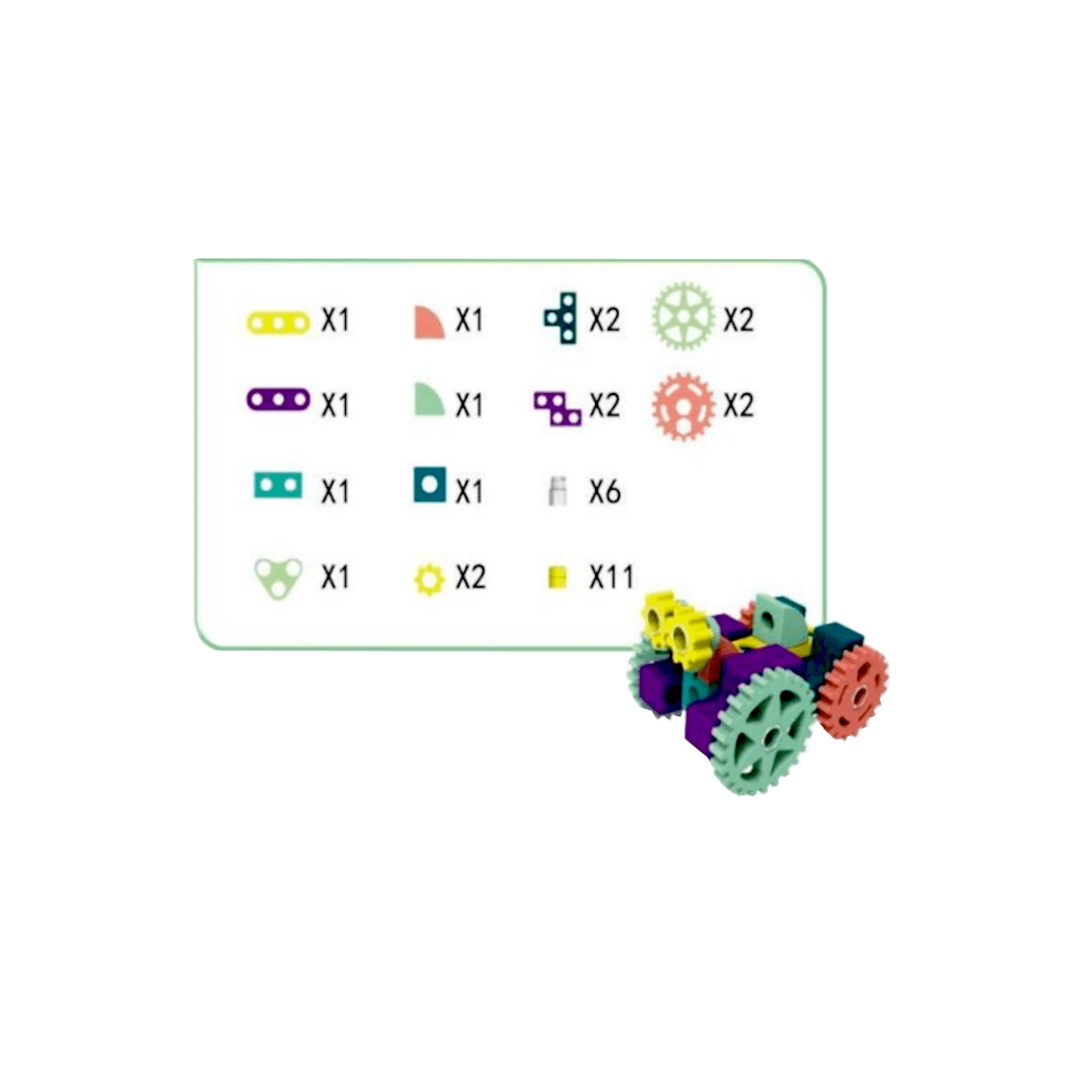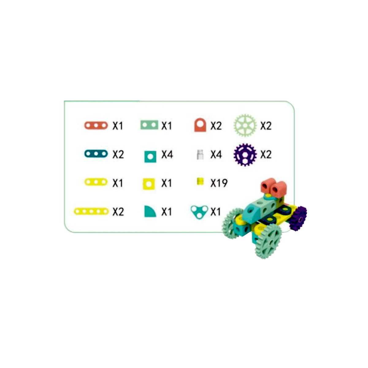 De GEAR JOY-set bevat grootschalige 3D-schuimelementen aangevuld met kunststof koppelstukken, waarmee kinderen eenvoudig hun eigen, originele constructies bouwen. Op de doos vind je een overzichtelijke handleiding met de bouwstappen voor twee verschillende automodellen, die inspireert tot verdere creatieve ideeën en de basis van kleine mechanica leert – alles in de vorm van spelplezier.