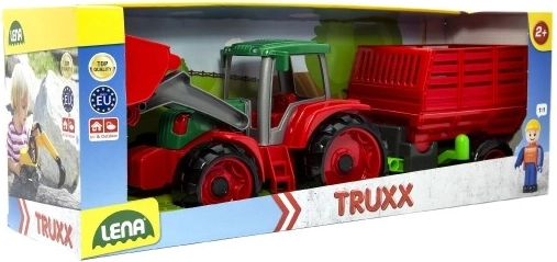 We presenteren u Lena Truxx tractor met aanhanger, het ideale speelgoed voor kleine boeren. Deze plastic tractor valt op door zijn robuuste ontwerp in rood en groen, aangevuld met een functionele laadbak en afneembare aanhanger. In de cabine van de tractor bevindt zich een klein figuurtje van de bestuurder, dat bijdraagt aan de realistische beleving van het spel.