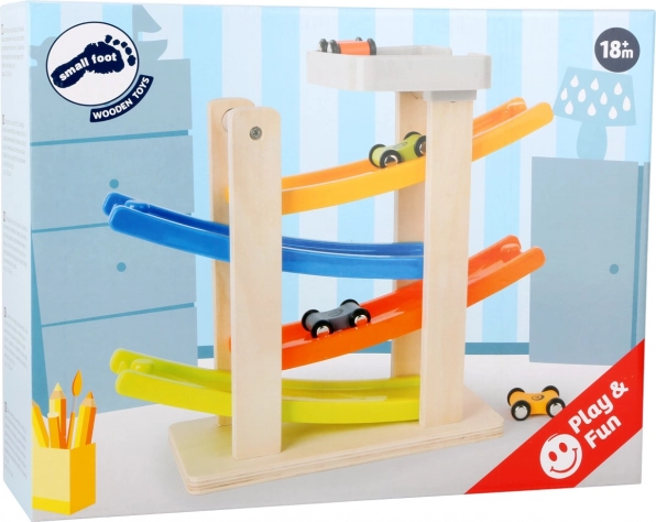 Een leuke houten klip klap baan met kleurrijke hellingen en vier autootjes is een geweldige manier om de motorische vaardigheden en coördinatie van kinderen te ontwikkelen. Stabiele basis en een modern kleurrijk ontwerp zorgen ervoor dat de baan een geliefde aanvulling wordt in elke kinderkamer.