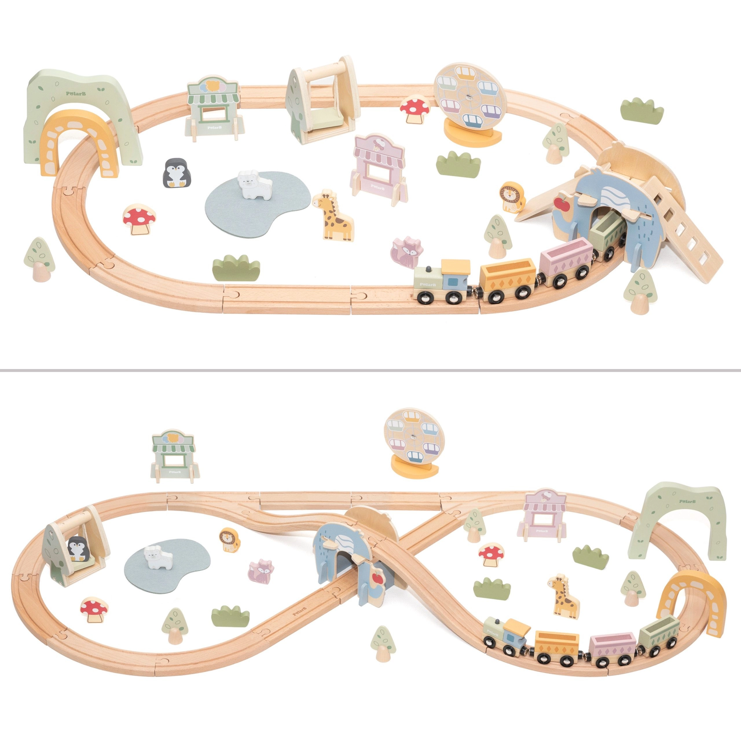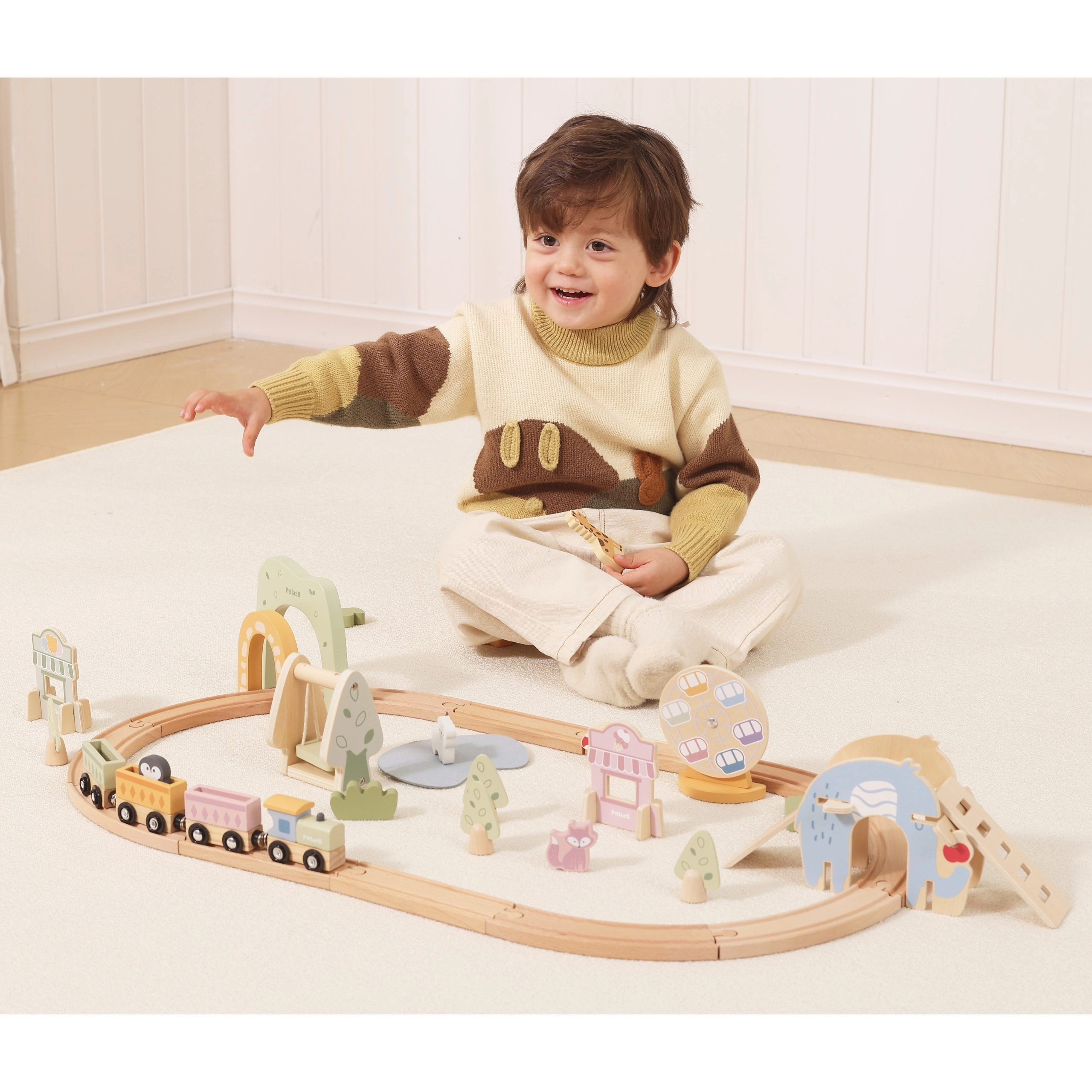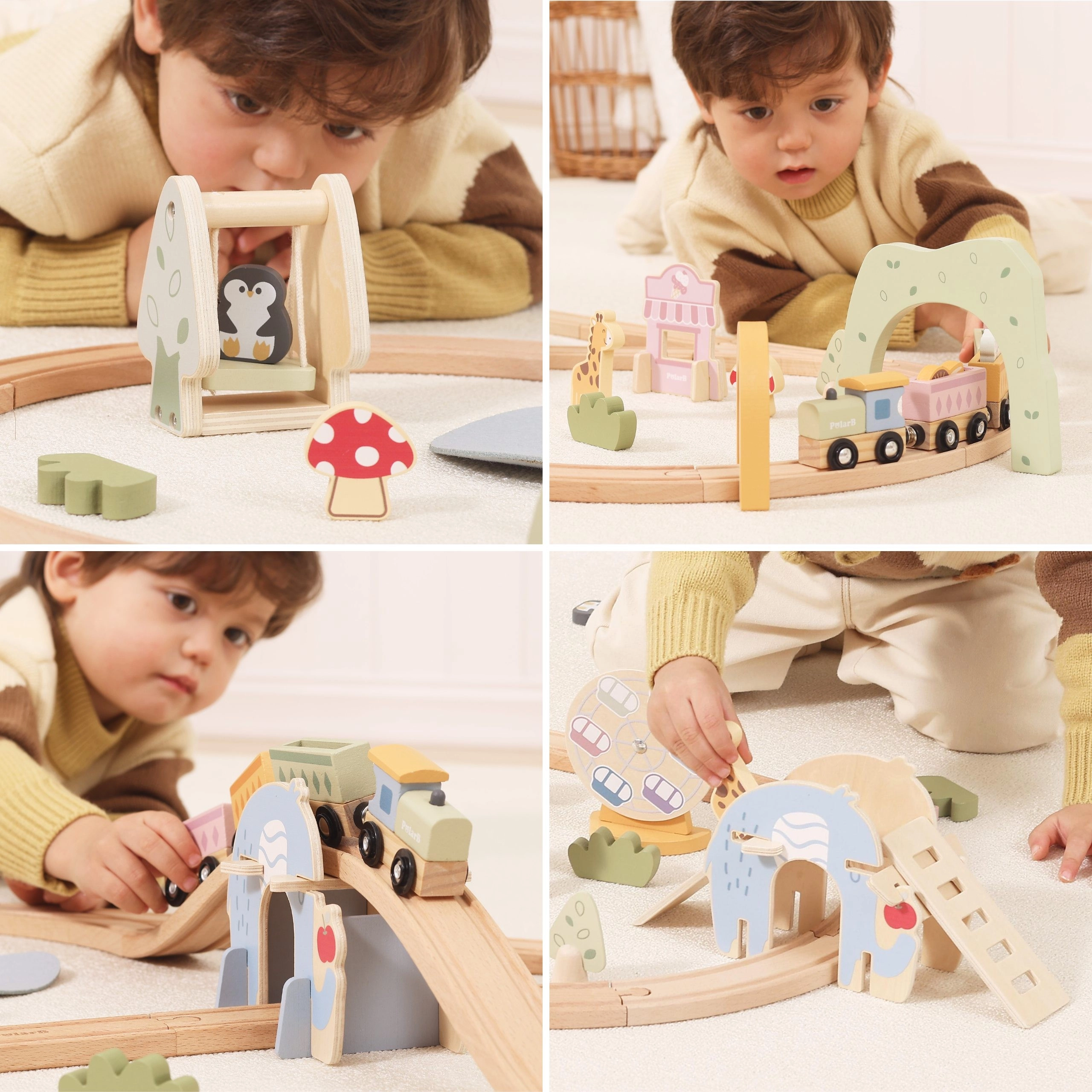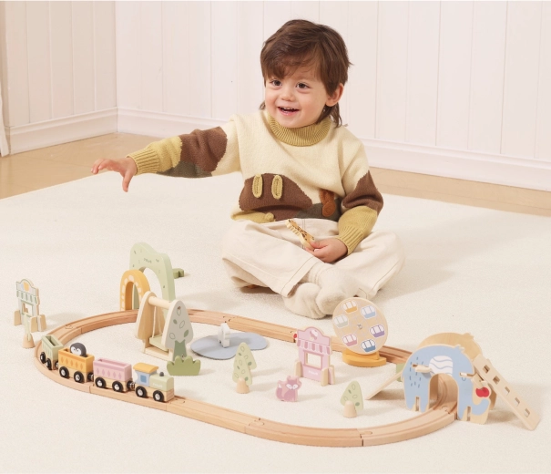 Ontdek een wereld vol fantasie met de houten treinbaan van Viga met 62 delen. Kinderen bouwen hun eigen sporen met bruggen en tunnels, koppelen wagonnetjes met magneten en genieten van uren creatief spel. Het gladde hout, de pasteltinten en het eenvoudig koppelen van de rails stimuleren de fijne motoriek, coördinatie en ruimtelijk inzicht.