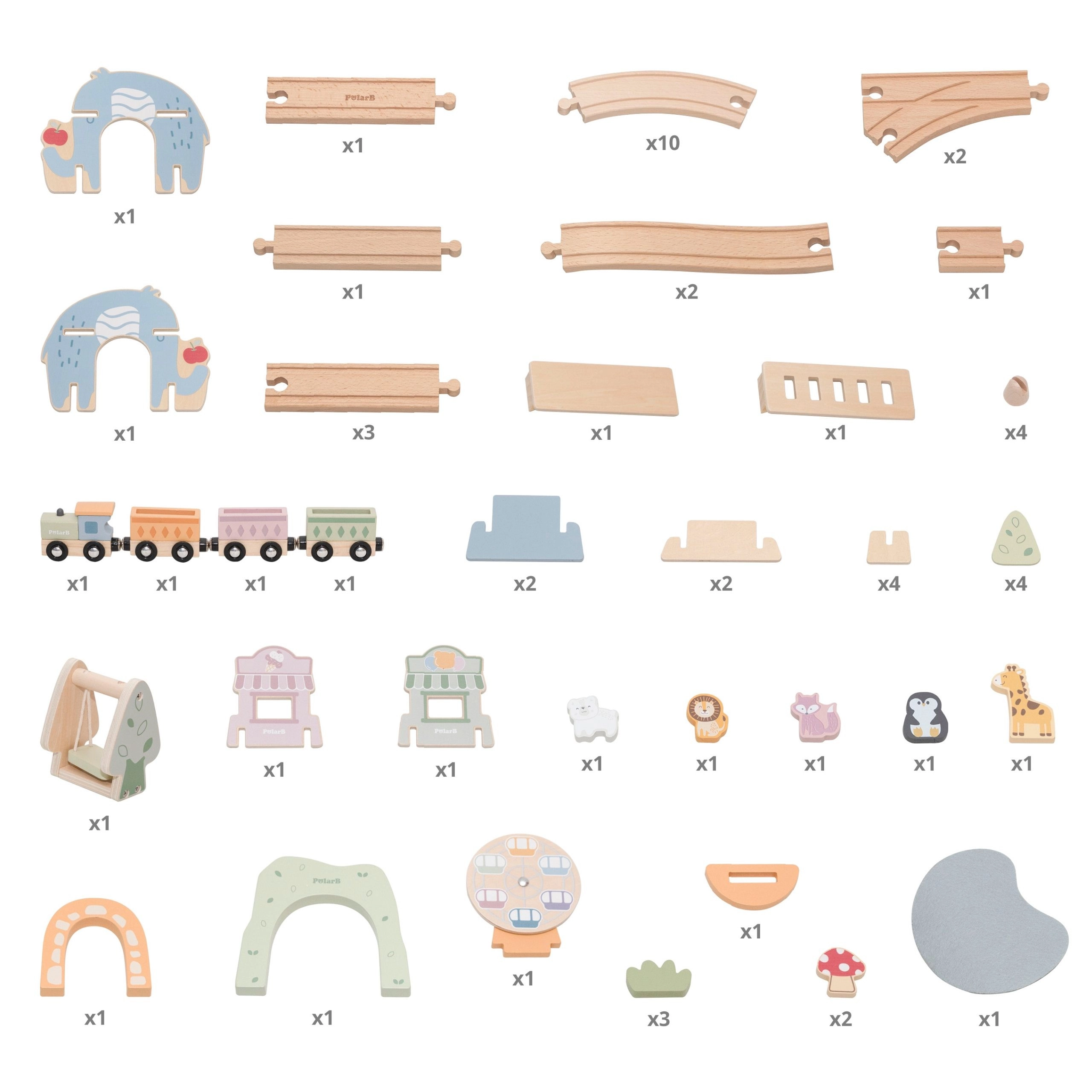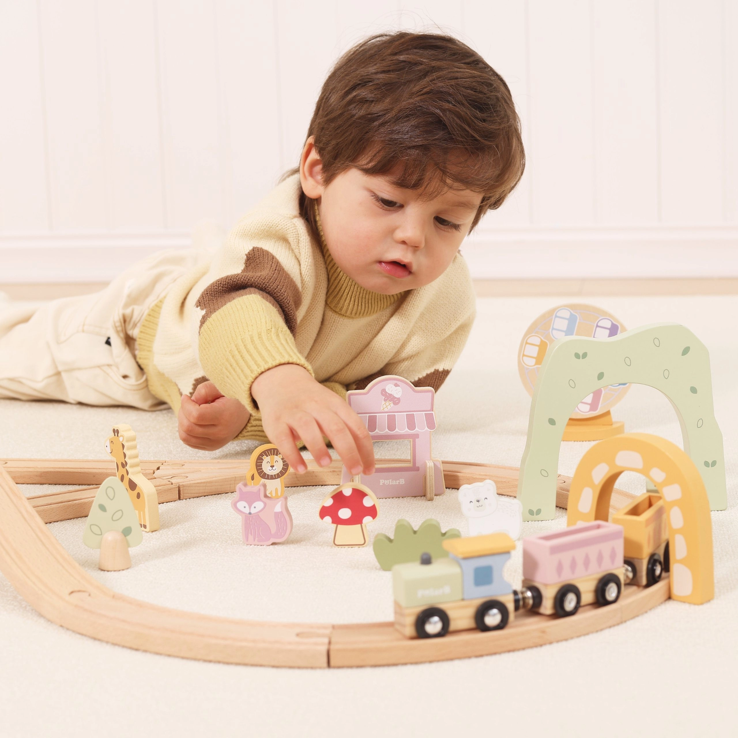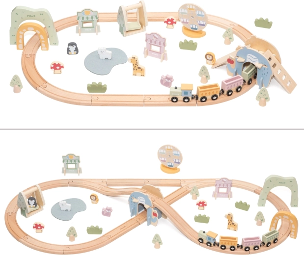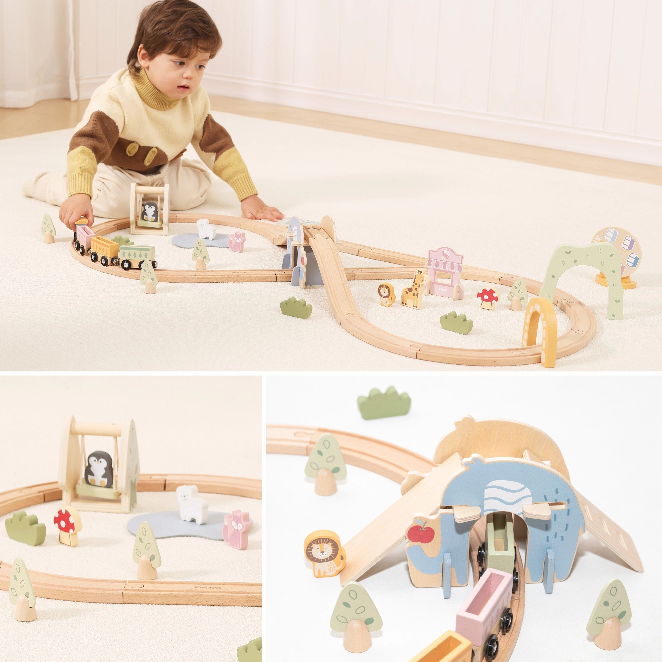 Ontdek een wereld vol fantasie met de houten treinbaan van Viga met 62 delen. Kinderen bouwen hun eigen sporen met bruggen en tunnels, koppelen wagonnetjes met magneten en genieten van uren creatief spel. Het gladde hout, de pasteltinten en het eenvoudig koppelen van de rails stimuleren de fijne motoriek, coördinatie en ruimtelijk inzicht.
