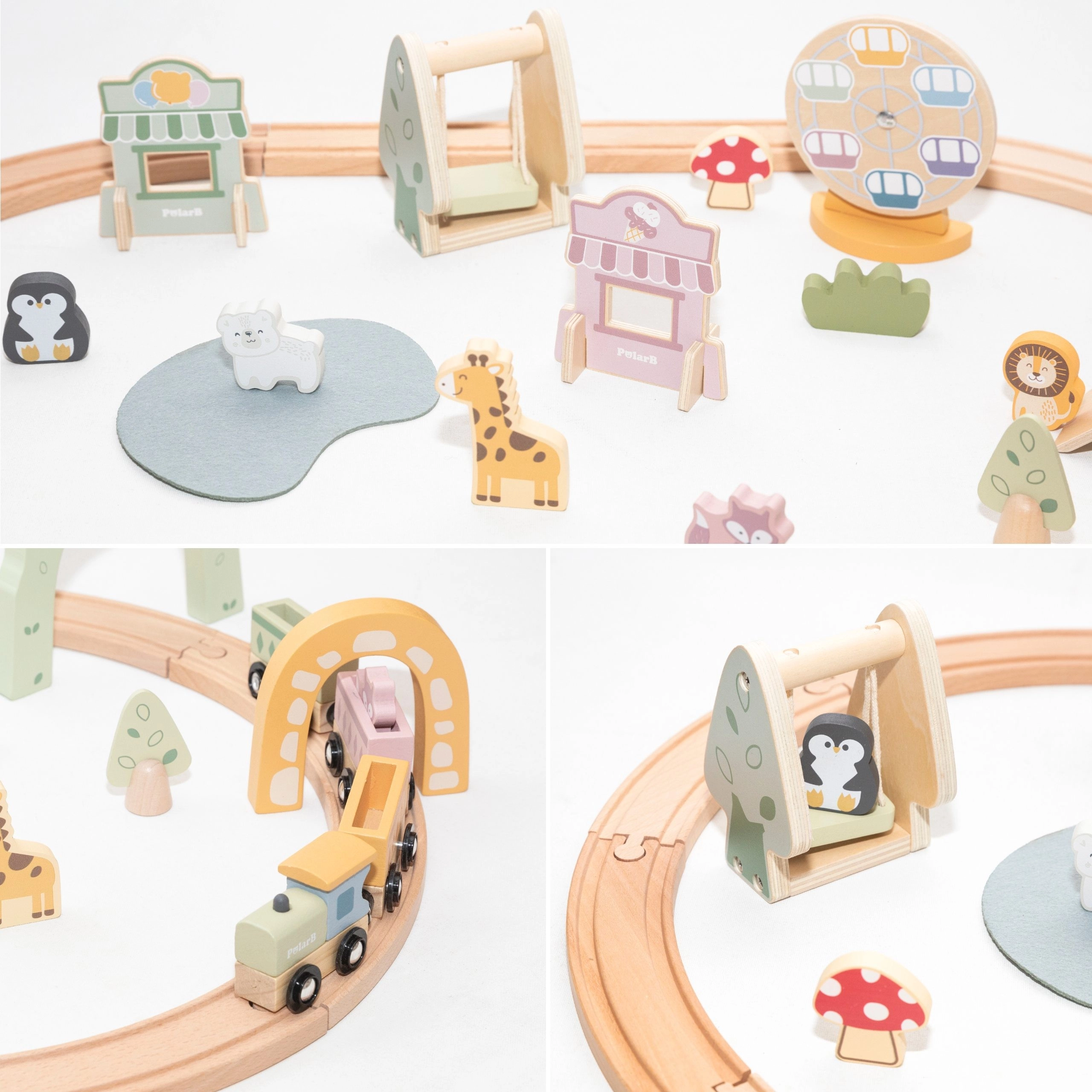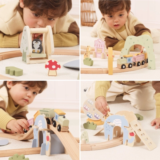 Er zijn ook schattige dierenfiguurtjes, boompjes, gebouwen en elementen van een “vrolijke stad” inbegrepen, die het spel verhalen en emoties geven. Dankzij de pastelkleuren en de gladde randen is de set niet alleen veilig, maar ook esthetisch aantrekkelijk in de kinderkamer.