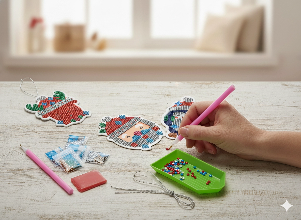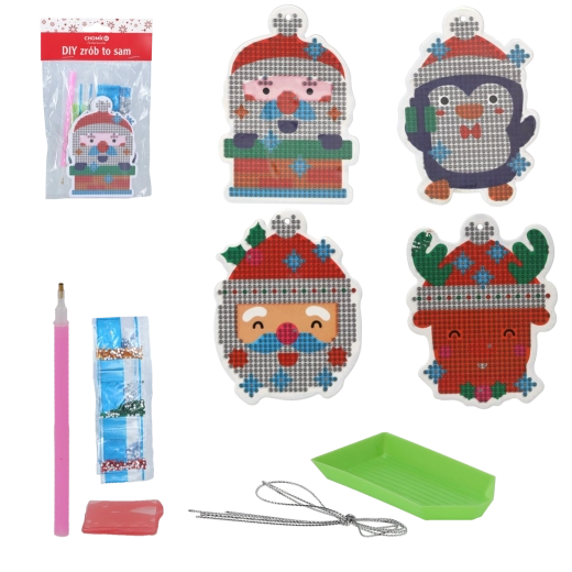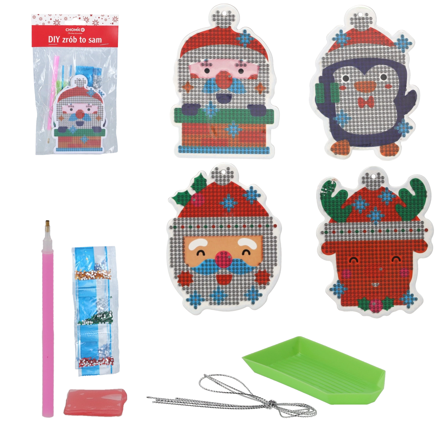 Breng de magie van Kerst in huis met de creatieve set diamond painting DIY. Maak fonkelende ornamenten met kerstmotieven (Kerstman, rendier, pinguïn) met behulp van zelfklevende sjablonen, een applicator en gekleurde steentjes. Perfecte ontspannende activiteit voor kinderen en volwassenen en een prachtige decoratie voor de boom, het raam en cadeaus.