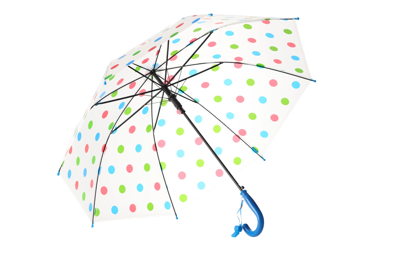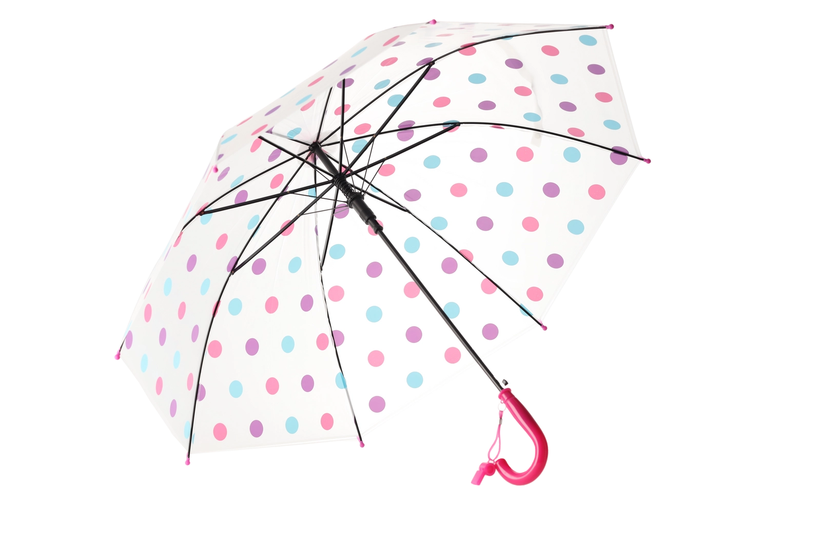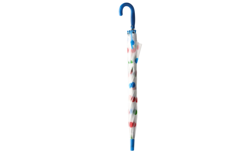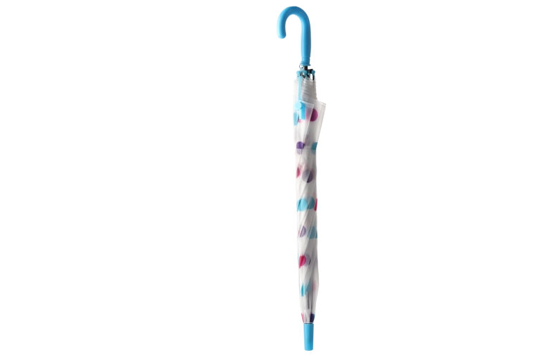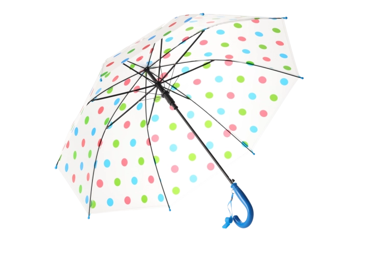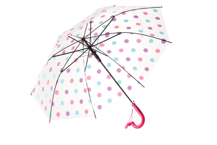 De stijlvolle transparante kap met veelkleurige stippen past bij diverse outfits en verbetert tegelijk het zicht op je omgeving tijdens het lopen in de regen.