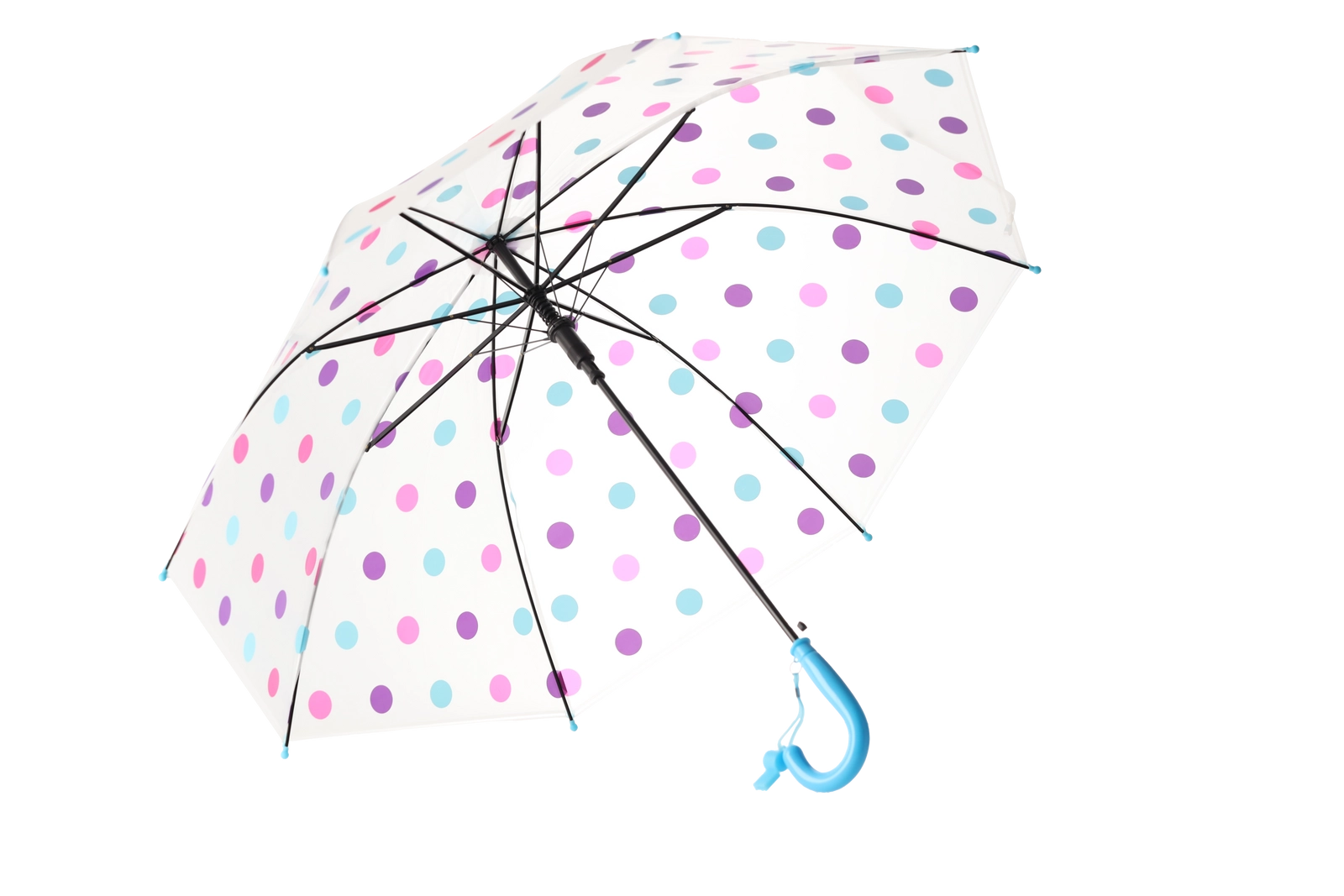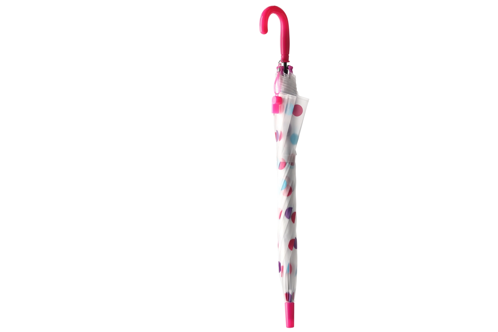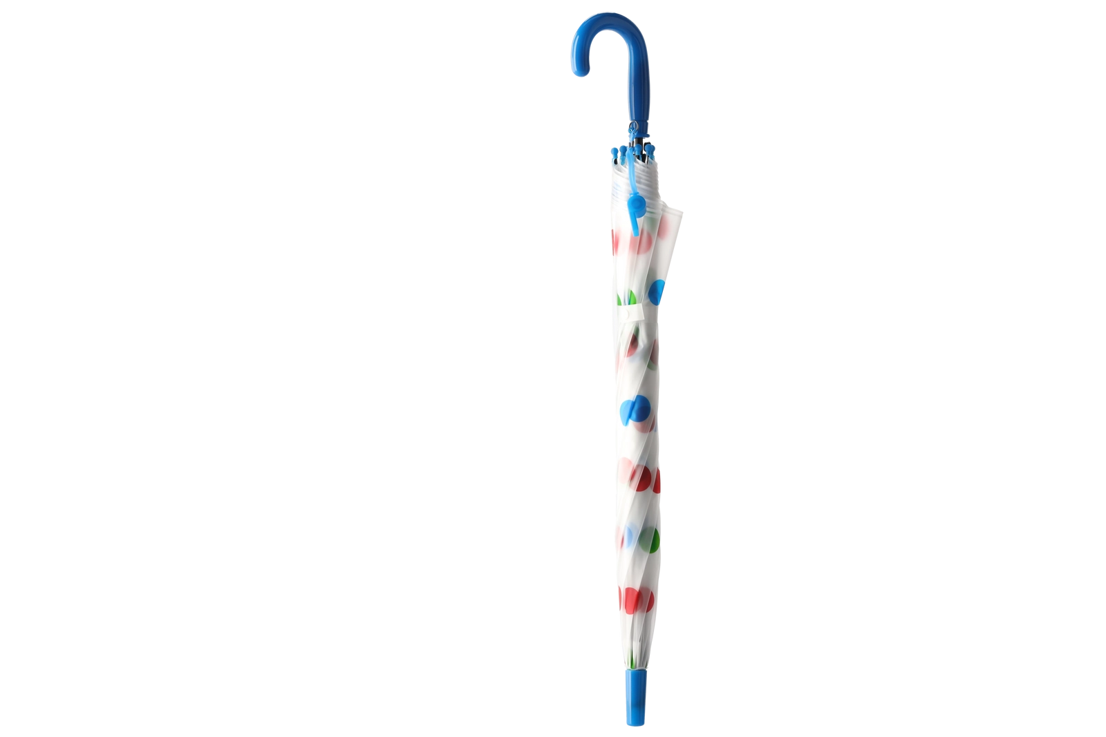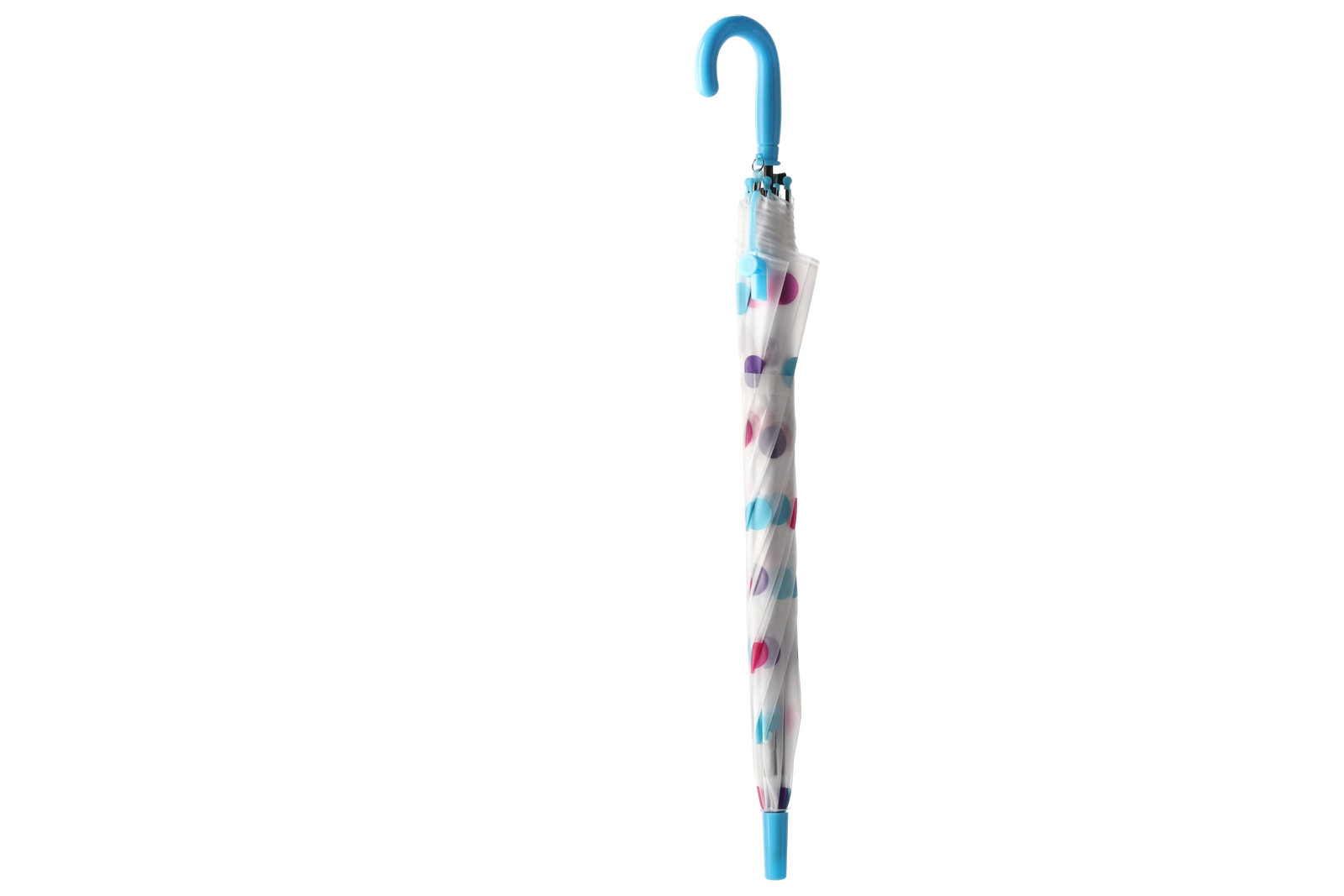 De stijlvolle transparante kap met veelkleurige stippen past bij diverse outfits en verbetert tegelijk het zicht op je omgeving tijdens het lopen in de regen.