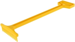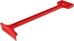 De lange steel en de gevormde uiteinde zorgen voor een stabiele grip bij het harken van zand en bladeren.