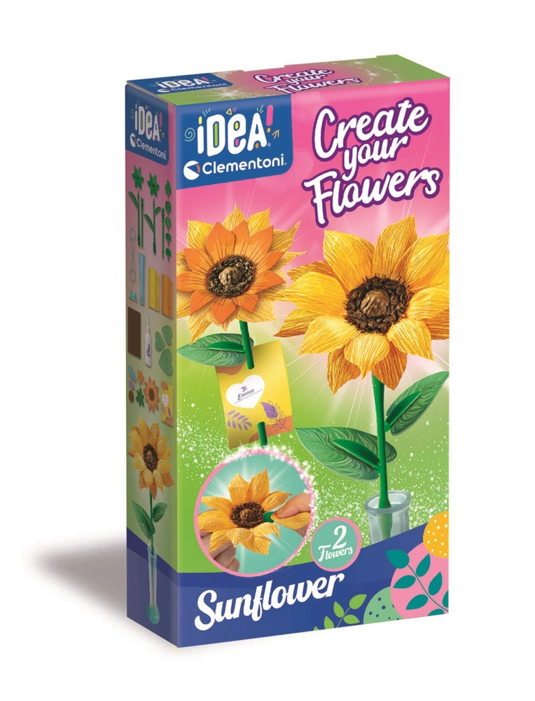 Ontdek de creatieve set uit de Idea Art-lijn, waarmee kinderen eenvoudig twee opvallende zonnebloemen van crêpepapier maken. Deze leuke activiteit ontwikkelt creativiteit, fijne motoriek en geduld, brengt plezier in het zelf maken en biedt de mogelijkheid om een origineel cadeau voor dierbaren te bereiden. Gemaakt door CLEMENTONI met nadruk op kwaliteit en veiligheid.