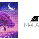 Het motief van een boom in roze‑paarse tinten met een halve maan creëert een indrukwekkende mozaïek die prachtig glinstert in het licht.